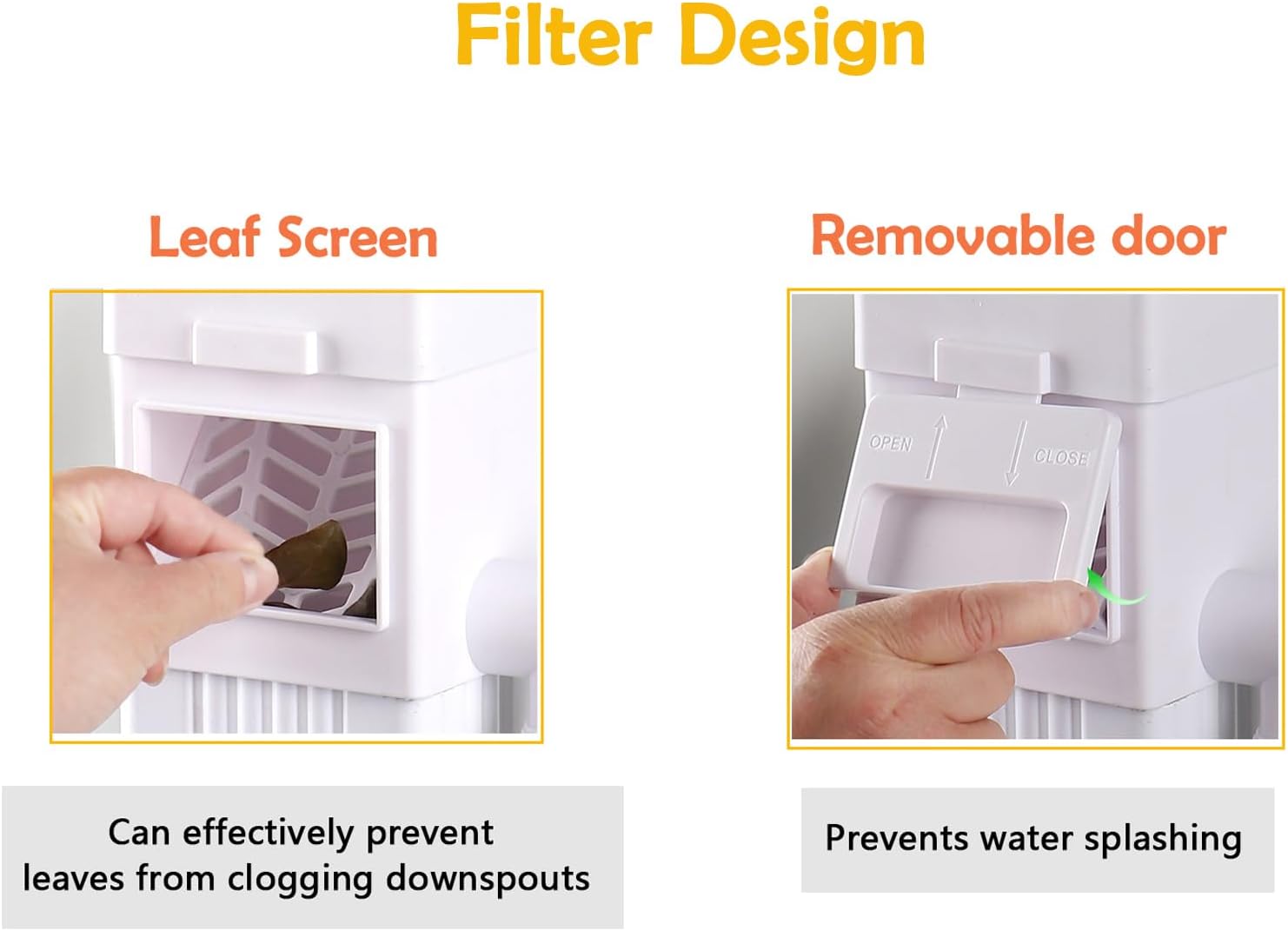 - Enhanced filtering rainwater collection system, is equipped with a removable filter cover and filter net, could filter out large leaves and other debris, not causing downspouts clogging, collected cleaner water.