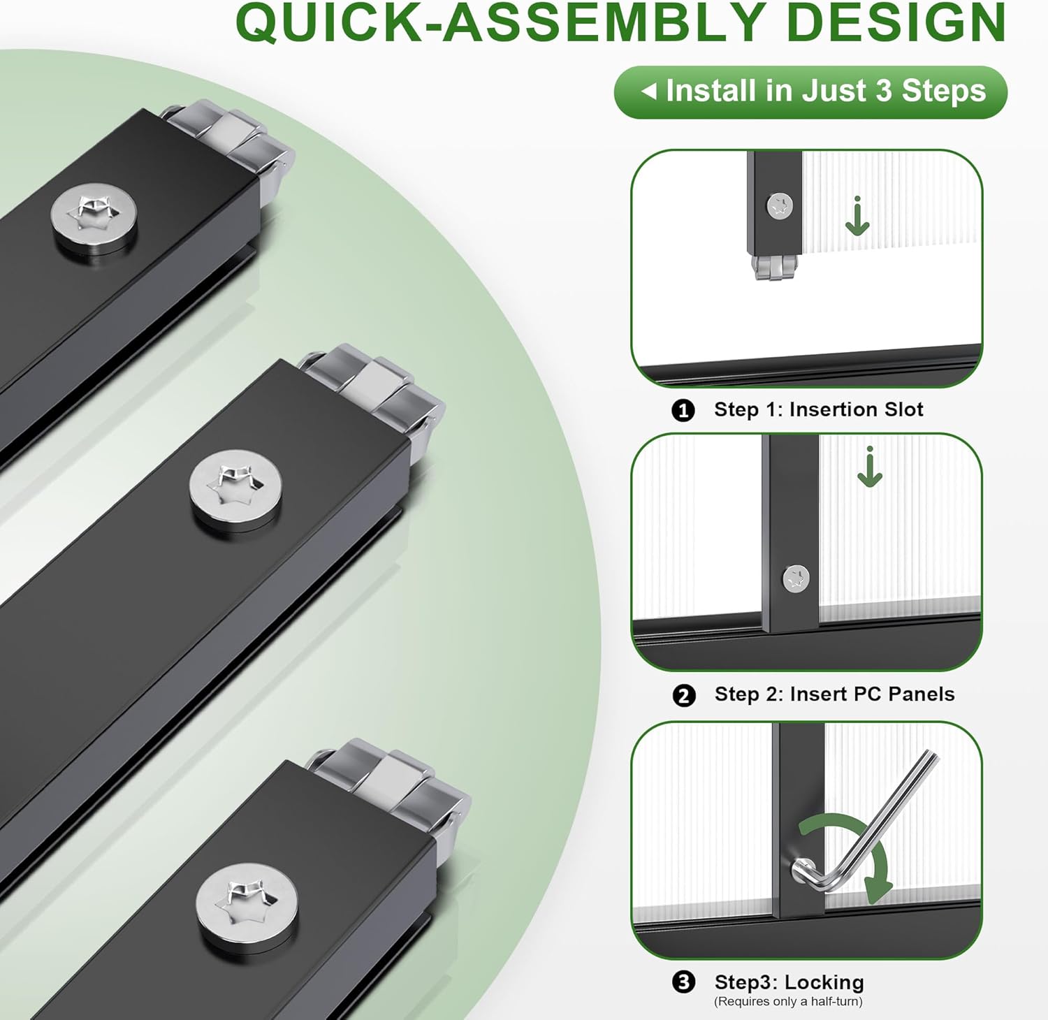 - Super Resistance: 720g PC panels provide greenhouse shelter from rain and snow. Outdoor greenhouse bottom 6cm aluminum alloy frame with eight diagonal support metal rods have superb stability.