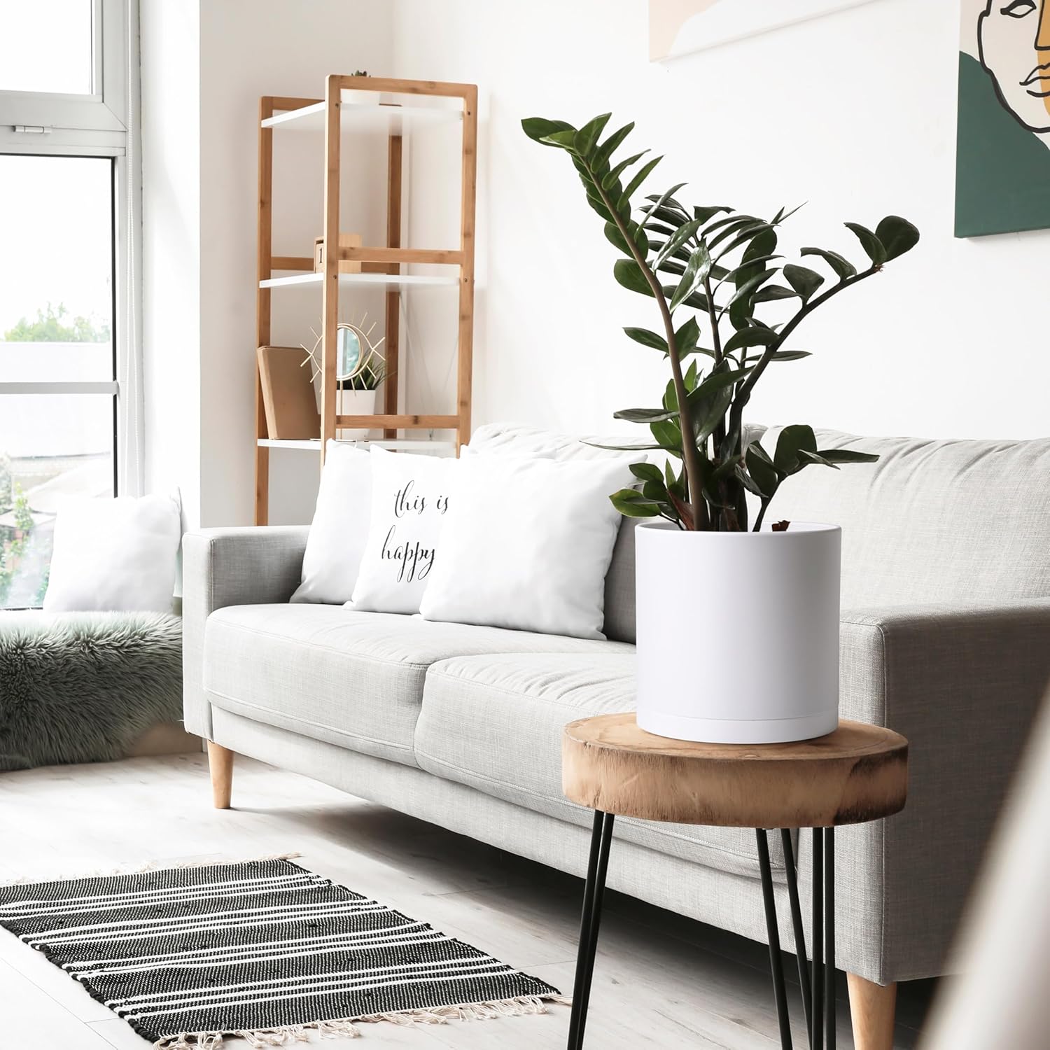 D'vine Dev 2 Pack 10 Inch Modern Plastic Plant Pots, Small Garden Planters for Plant with Drainage Holes and Saucers, White Color, 74-Z-N-1