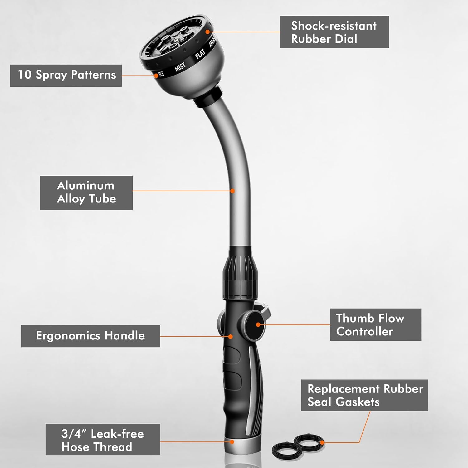 - 【Heavy Duty Metal Watering Wand】Constructed with premium zinc-alloy material, this 15-inch hose wand sprayer is solid & strong to resist daily drops and shocks. The bronze powder painting, TPU coating and rubberized bezel dial can enhance durability & flexibility and withstand hard impacts & heavy force. A long-lasting garden hose wand you can count on many years.
