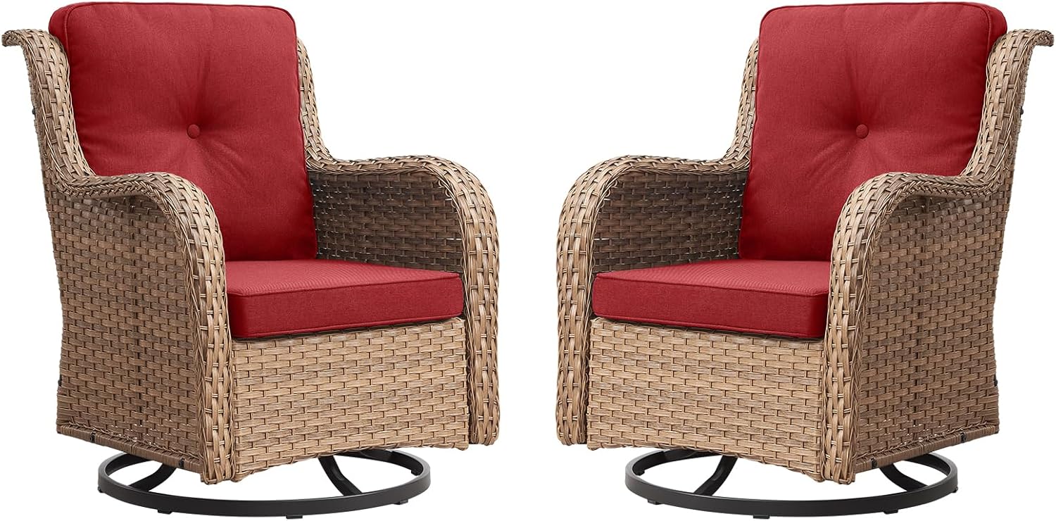 Outdoor Patio Swivel Rocker Chairs - Wicker Rattan Patio Swivel Rocking Chairs Set of 2 with High Back,Deep Seating and Comfort Cushions for Deck Porch Garden,Yellow/Red