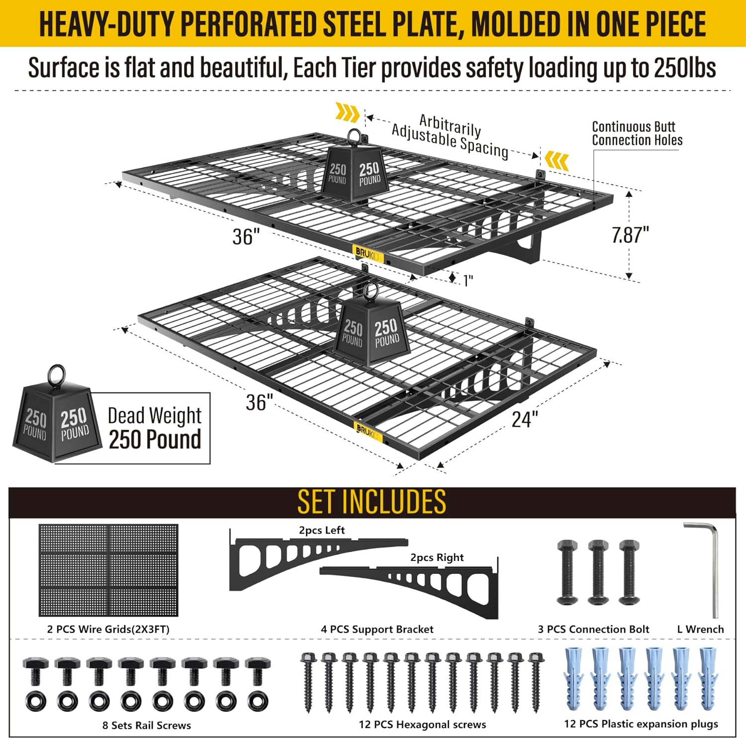 - KIT INCLUDES:Includes 1pc-Grid Shelf; 2pc-Brackets; 6pc-Hexagonal screws (Hardened ∅0.2" L/2"); 4Sets-Rail attachment bolts; 1pc- Drill bit; 1pc-Socket; 1pc-installation manual. All hardware of Brukid Professional Series Wall Mounted Shelf are under strict quality control and testing, We strive to provide our customers with a quality shopping experience, If you have any questions, Please feel free to contact us
