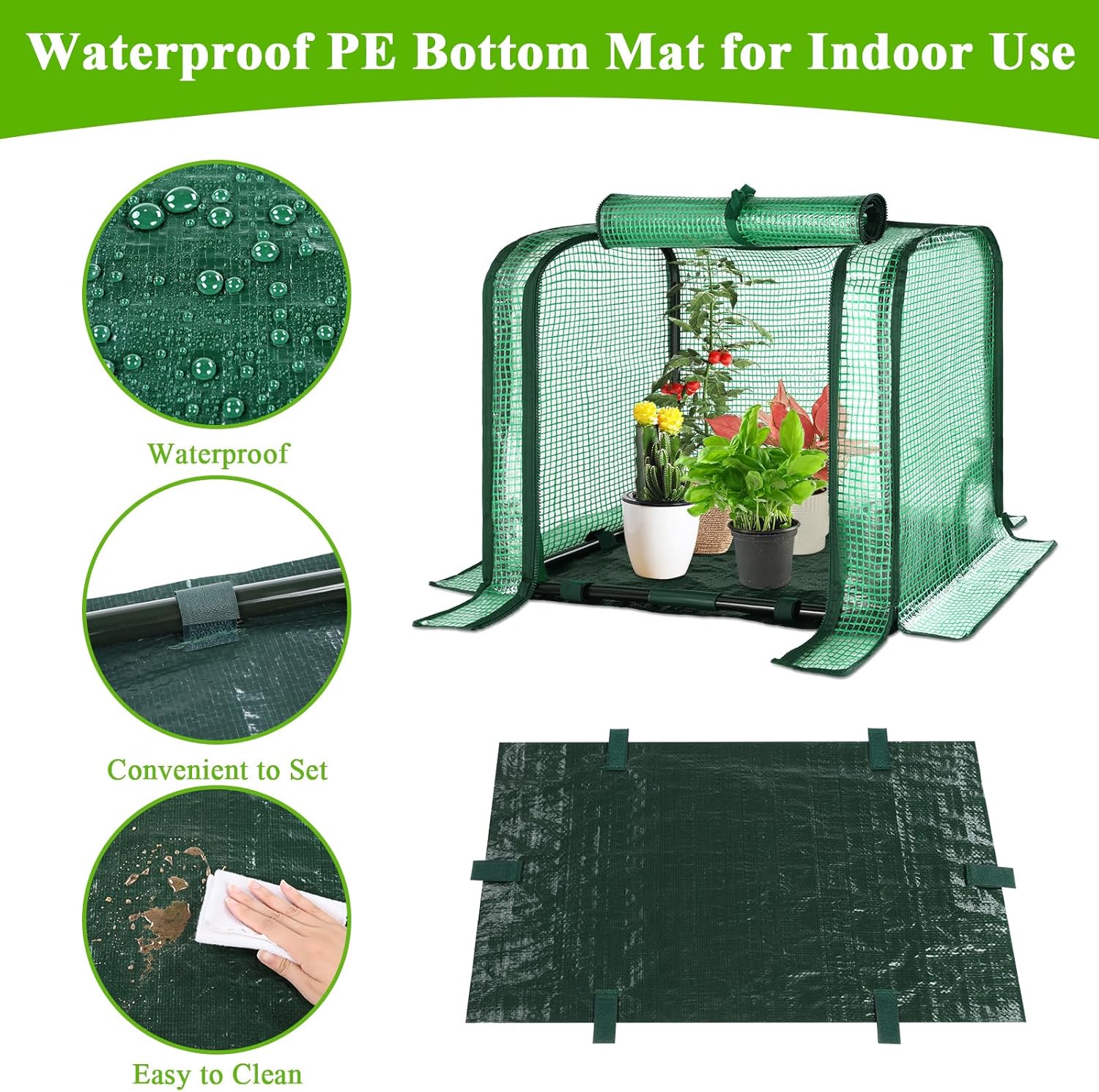 - With Waterproof Mat: Our green house for plants comes with waterproof mat, easy to use, avoid dirtying the ground when watering or pruning plants, and it can effectively keep warm when the temperature is low