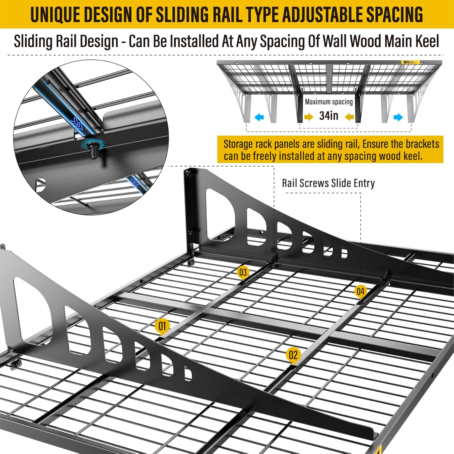 - SUPERIOR DESIGN: Wall shelf garage storage rack is made of heavy-duty frame structure and thicker wire mesh combined with welding, the panel and bracket connection is adjustable slide rail design, Both ends of the bracket can be installed freely in the 8"-45" range of wood wall keel spacing. Eliminating the worry of not being able to connect due to the mismatch of the spacing of the load-bearing wooden wall keel