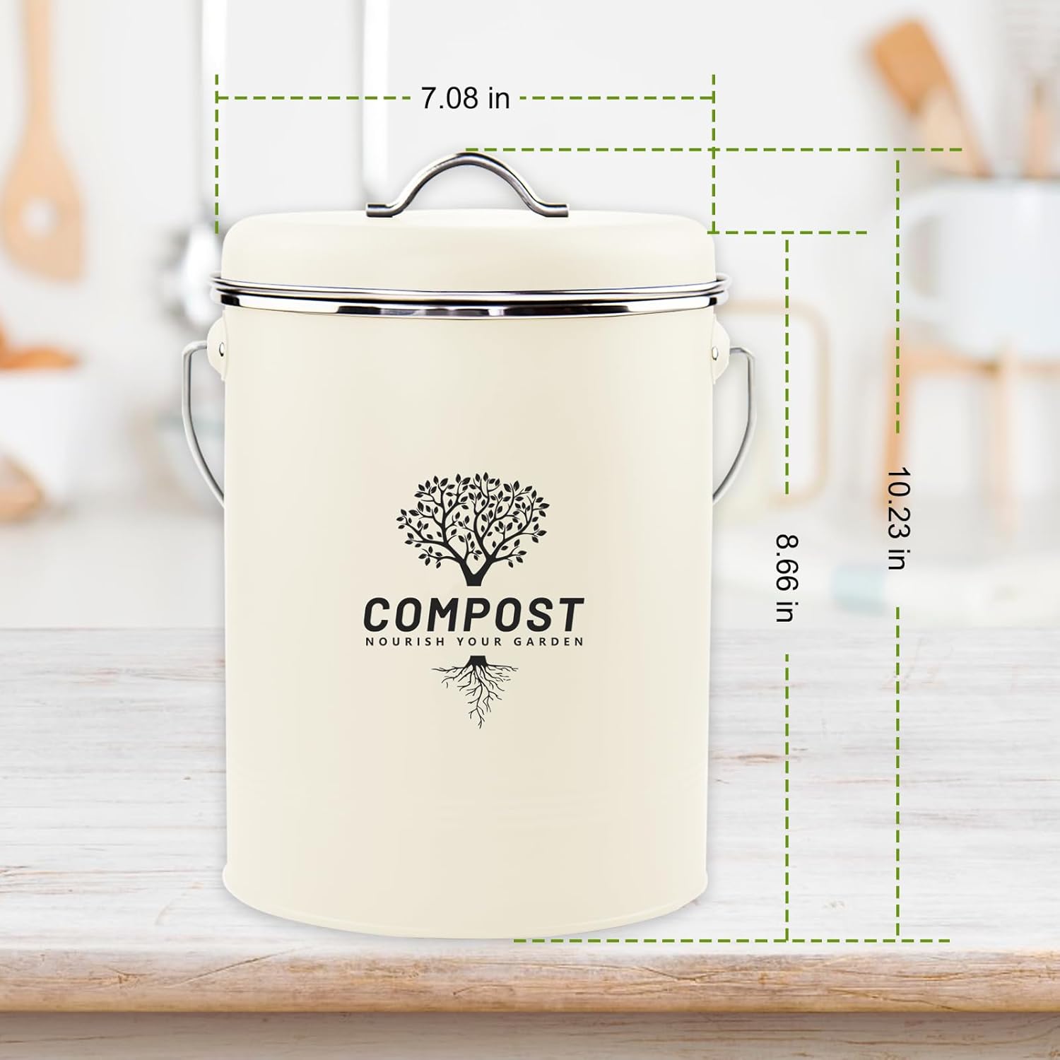 Kitchen Countertop Compost Bin, Odor Resistant Indoor Compost Bin with Lid and Charcoal Filter, Rust Resistant Coated Compost Bucket, Compost Container, Cream
