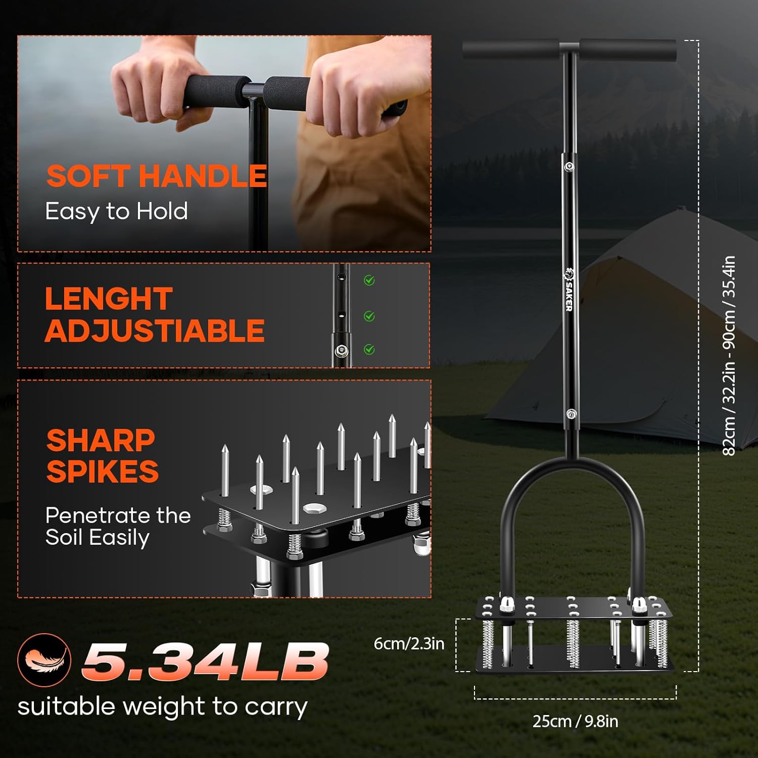 - 【High Efficiency 15 Sharp Spikes Desigh】Saker lawn air aerator tool have 15 sharp spikes,2.3inches working length. 15 spikes work at same time,which can greatly saves time and effort. Tool weight 5.34 pounds,the appropriate weight strikes a balance between efficient aeration and ease of use, ensuring high productivity without causing excessive fatigue.