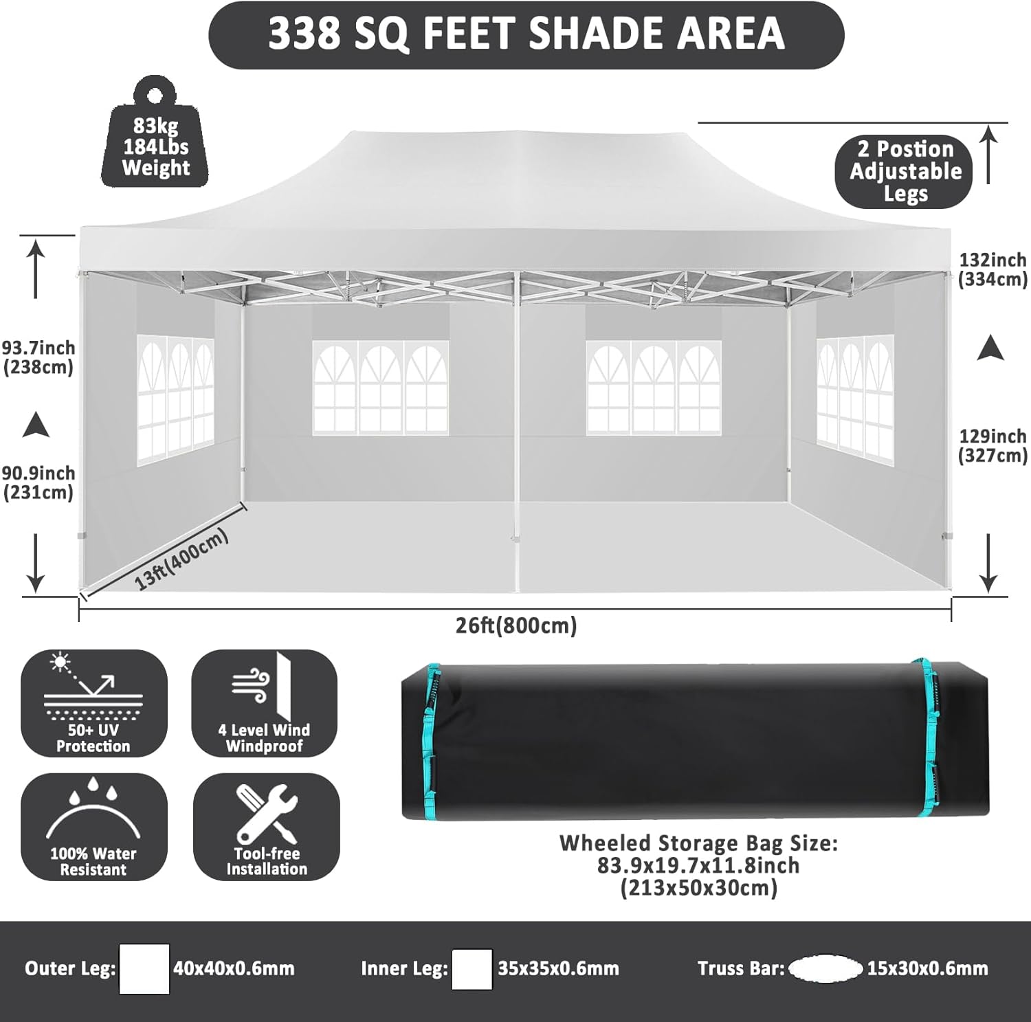 - 【2 Height Settings】13x26 pop up party tent straight leg has 2 height settings. Pull ring lock system easy to lock and release, raise the pop up tent to a desired height. Canopy tent 13x26 straight leg height options: 231cm/90.9inch, 238cm/93.7inch. Corresponding party tent center height options: 327cm/128.7inch,334cm/131.5inch. 13x26 canopy with sidewalls perfect for commercial activities, camping, festivals, tailgating, backyard events and etc..