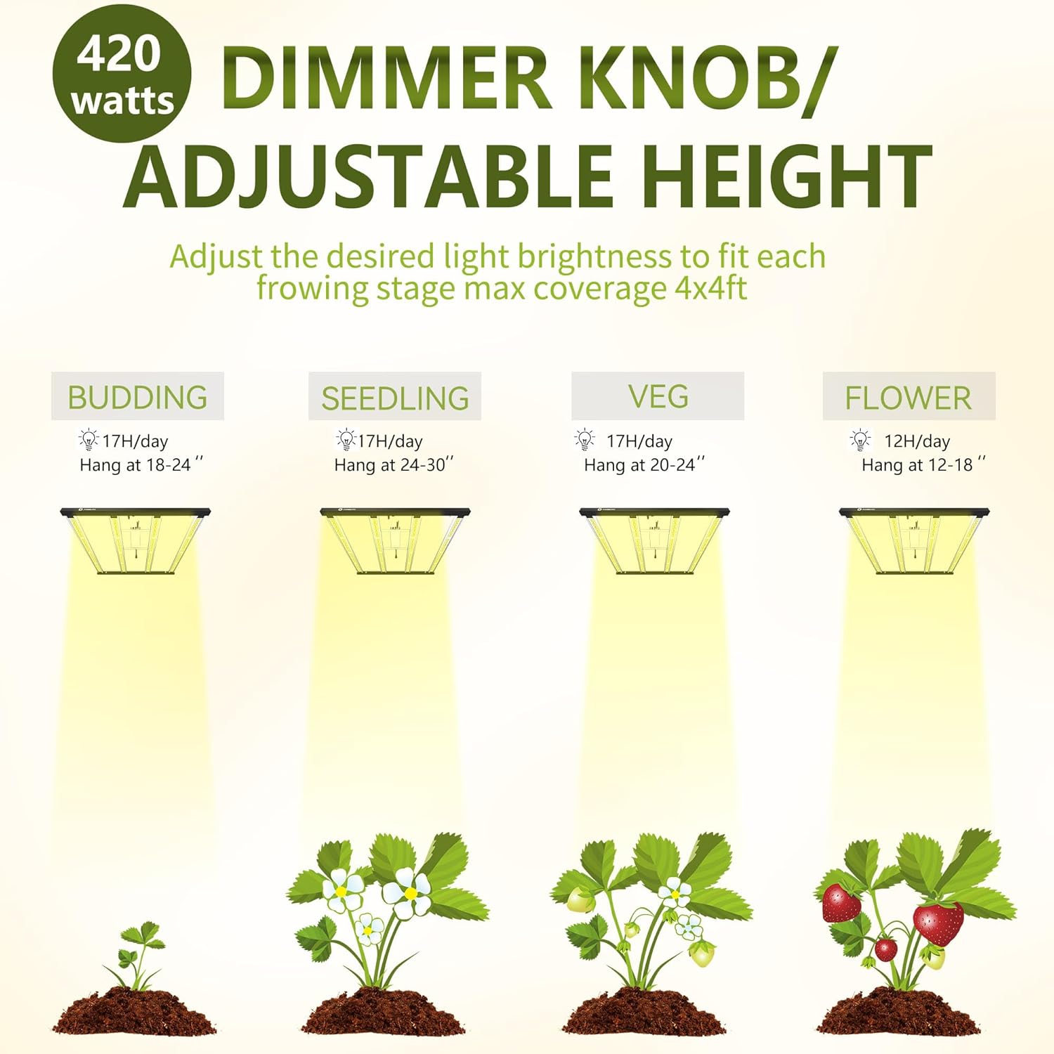 - 【Max Coverage Area Plant Lamp Full Spectrum】420watts grow light full spectrum (380-410 nm, 660-665nm, 730nm,3200-4200K,4800-5000K) is perfect for veg to grow,4 LED grow lights bars with 1580pcs Samsung diodes, it can provide evenly distributed light intensity.It can coverage for 4x5ft of high-yielding full-cycle growth.