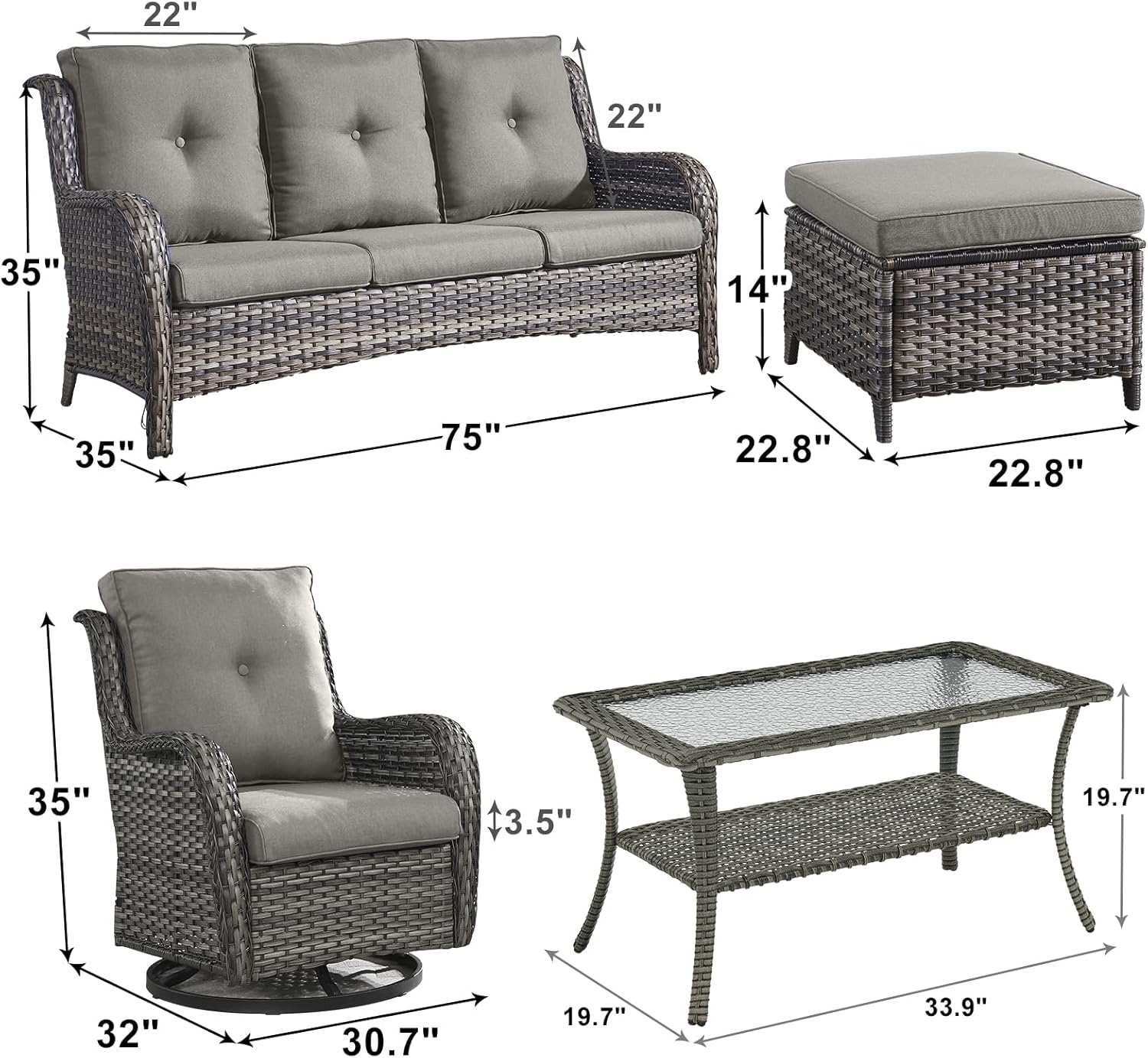 Outdoor Wicker Patio Furniture Set - 6 Piece Rattan Patio Conversation Set with 2 Rocking Swivel Chairs,2 Ottomans,1 Sofa and 1 Coffee Table for Porch Deck Backyard Garden(Mixed Grey/Grey)