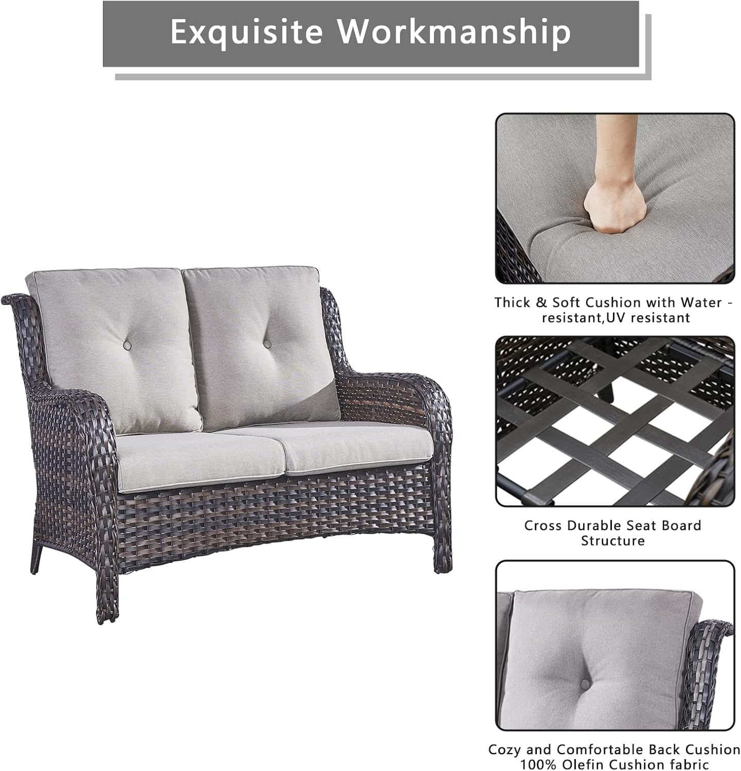 - 【Comfort Cushions & Deep Seating】This patio wicker swivel chairs and loveseat feature deep and wide seats,with 4-inch thick sponge-padded seat cushions,5-inch back cushion create the ultimate patio seating experience.