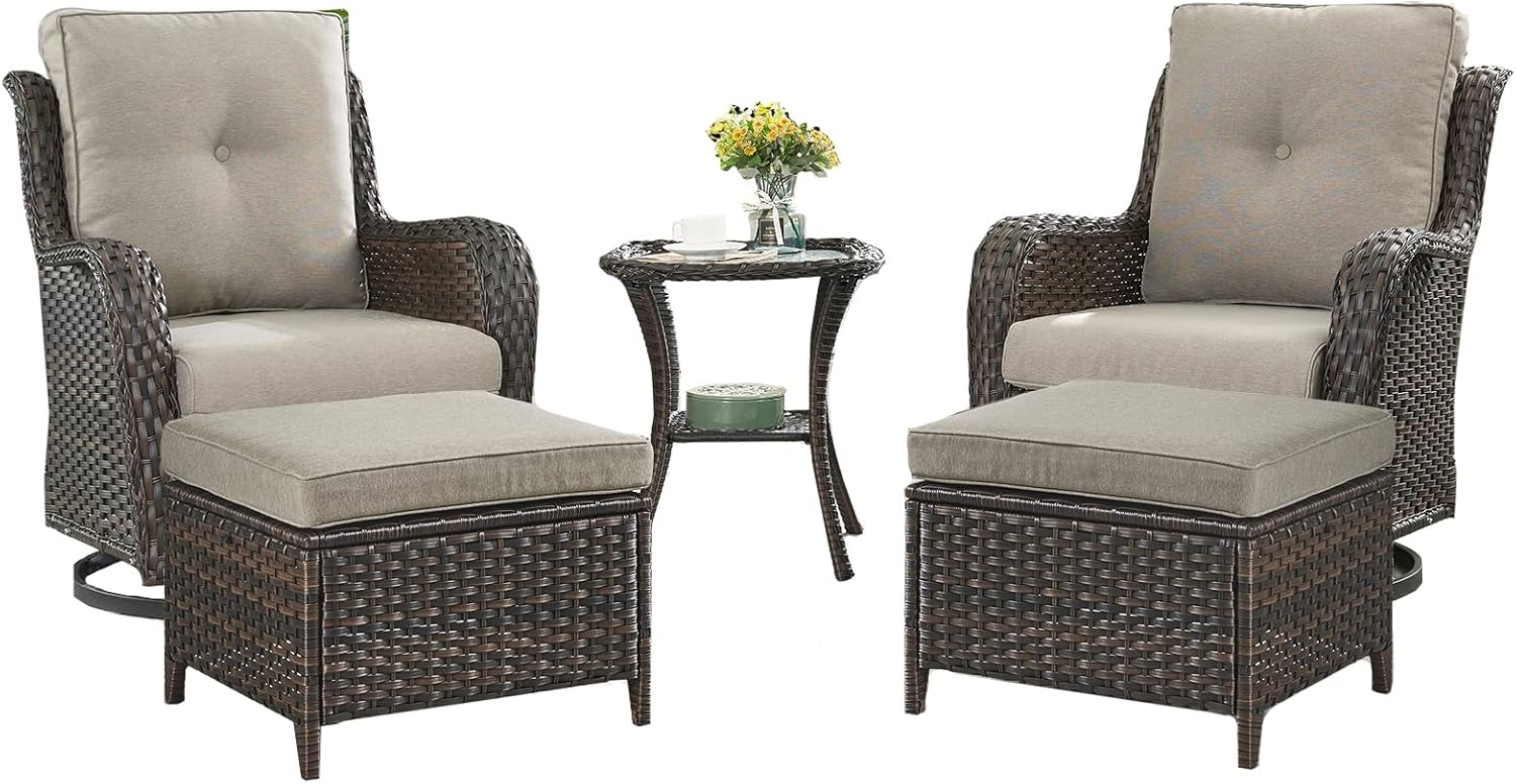 Outdoor Wicker Patio Furniture Set - 5 Pieces Rattan Patio Conversation Set with 2 Rocking Swivel Chairs,2 Ottomans and 1 Side Table for Porch Deck Backyard Garden(Brown/Grey)