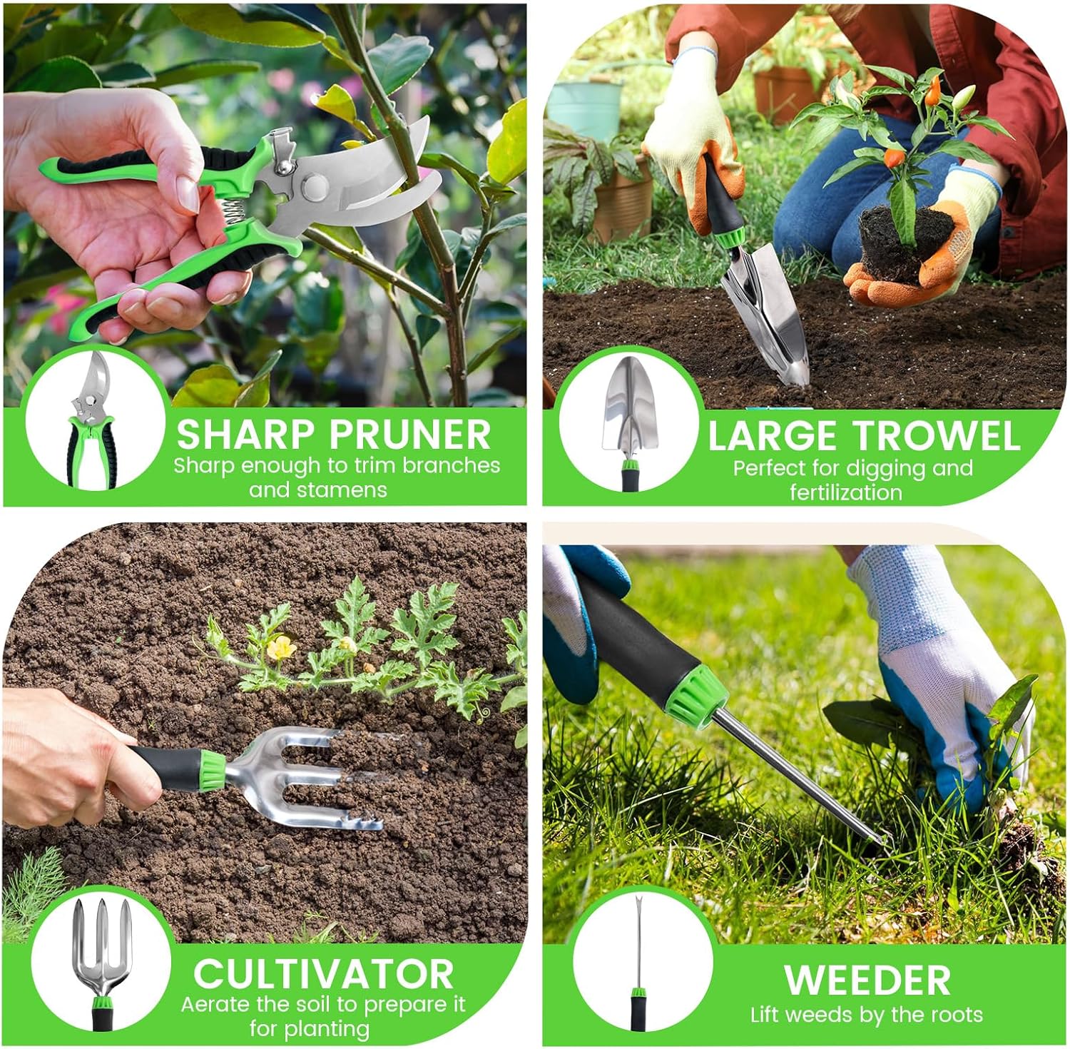 - 【Two Removable tool bag & 4 Heavy Duty Garden Tools】 The gardening tool sets includes a large trowel, cultivator, weeder, pruning shears and an Oxford cloth Tool hand bag+tool pouch to keep all your tools packed away provides everything you need to maintain a beautiful and healthy garden.