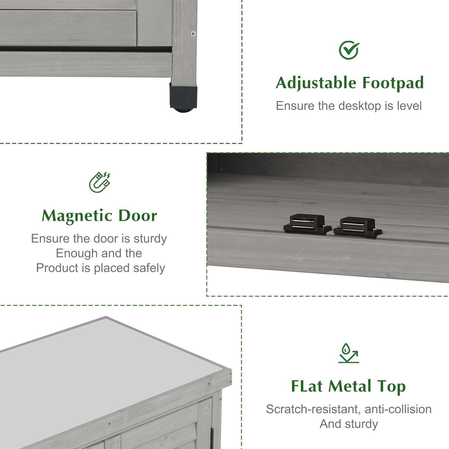 - 【MULTI-USE POTTING BENCH】 It's a multifunctional potting bench with flat metal table top, you can use it for storage cabinet indoor, working bench outdoor, and doing stuffs in garage