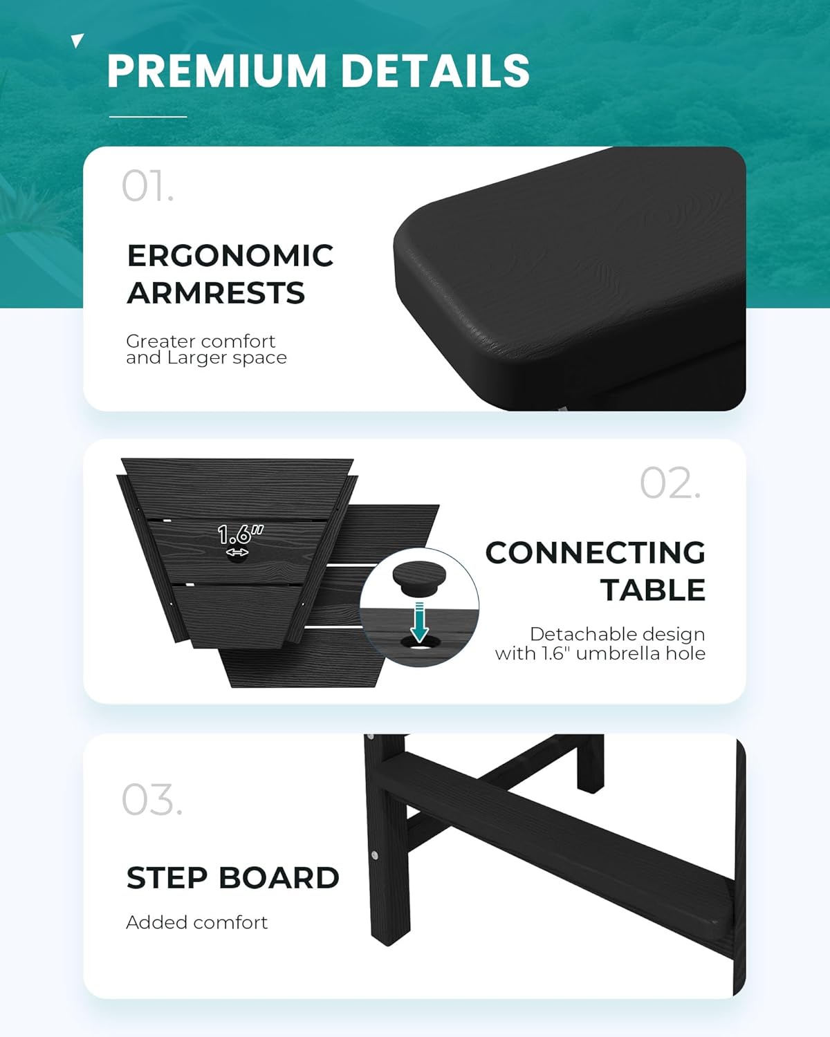 SERWALL Tall Adirondack Chairs Set of 2 with Connecting Table, All Weather Outdoor Barstools, Black