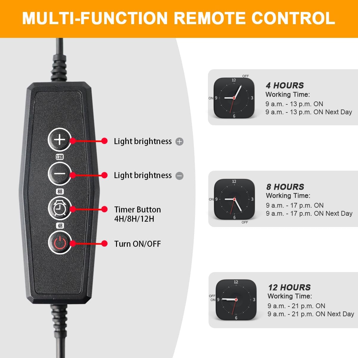 - A Versatile Controller: This growth light offers 3 timing options, enables you to keep the light on for 4/8/12 hrs. It is supposed to last for 2000 cycles and only needs electricity $2.00 (12 hrs/day) every month. That's a good value for the cost. In addition, you can adjust the brightness according to your needs.