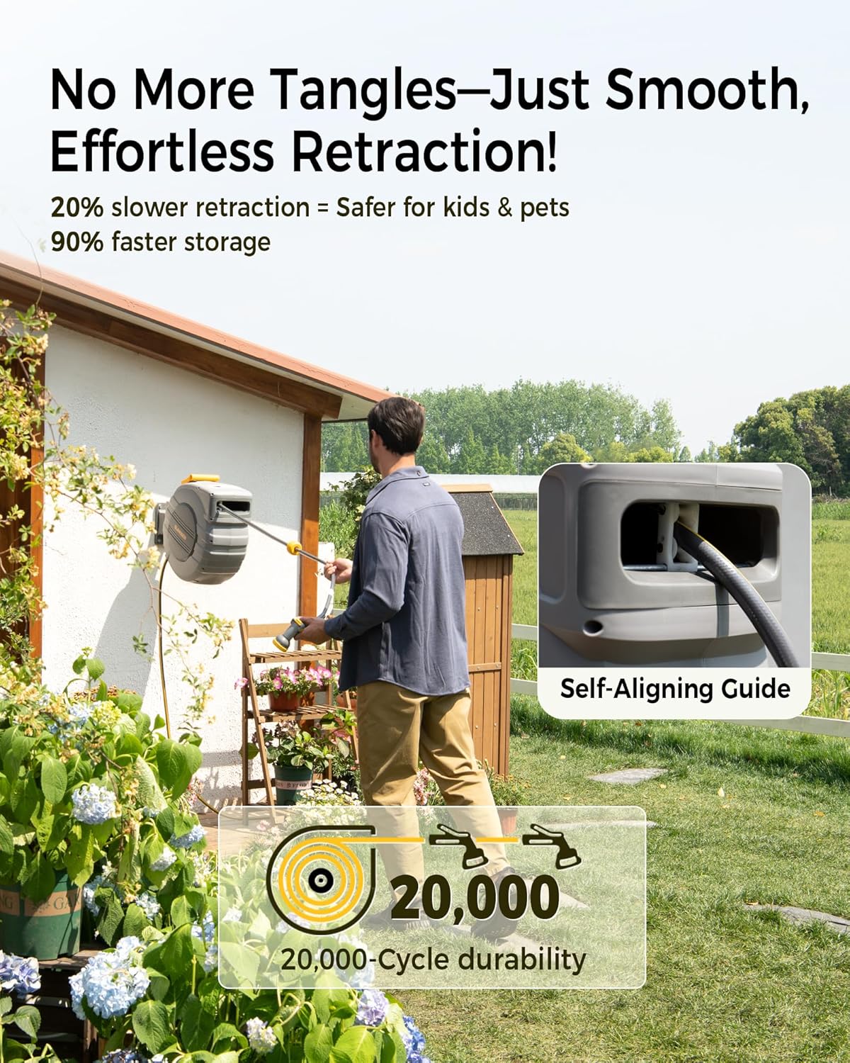 - 20,000-Cycle Self-Winding System: Industrial-grade alloy spring ensures consistent retraction force. The self-winding hose reel retracts 20% slower to prevent whipping hazards while achieving 90% faster storage with smooth, tangle-free operation
