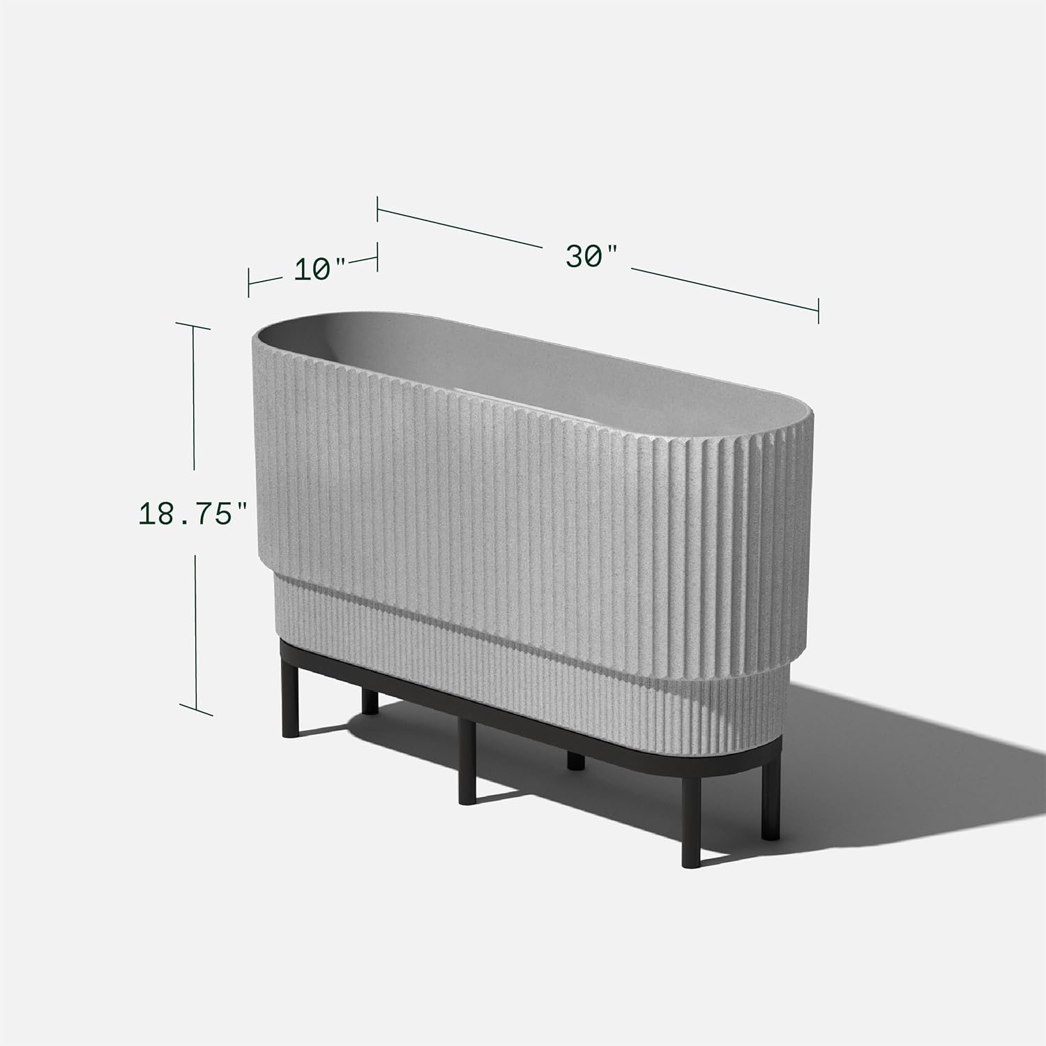 - DIMENSIONS & DETAILS: The Raised Demi Long planter measures 30 Inches in length, 10 inches in width and 14.25 Inches in height. On the stand, the planter measures 19 Inches in height