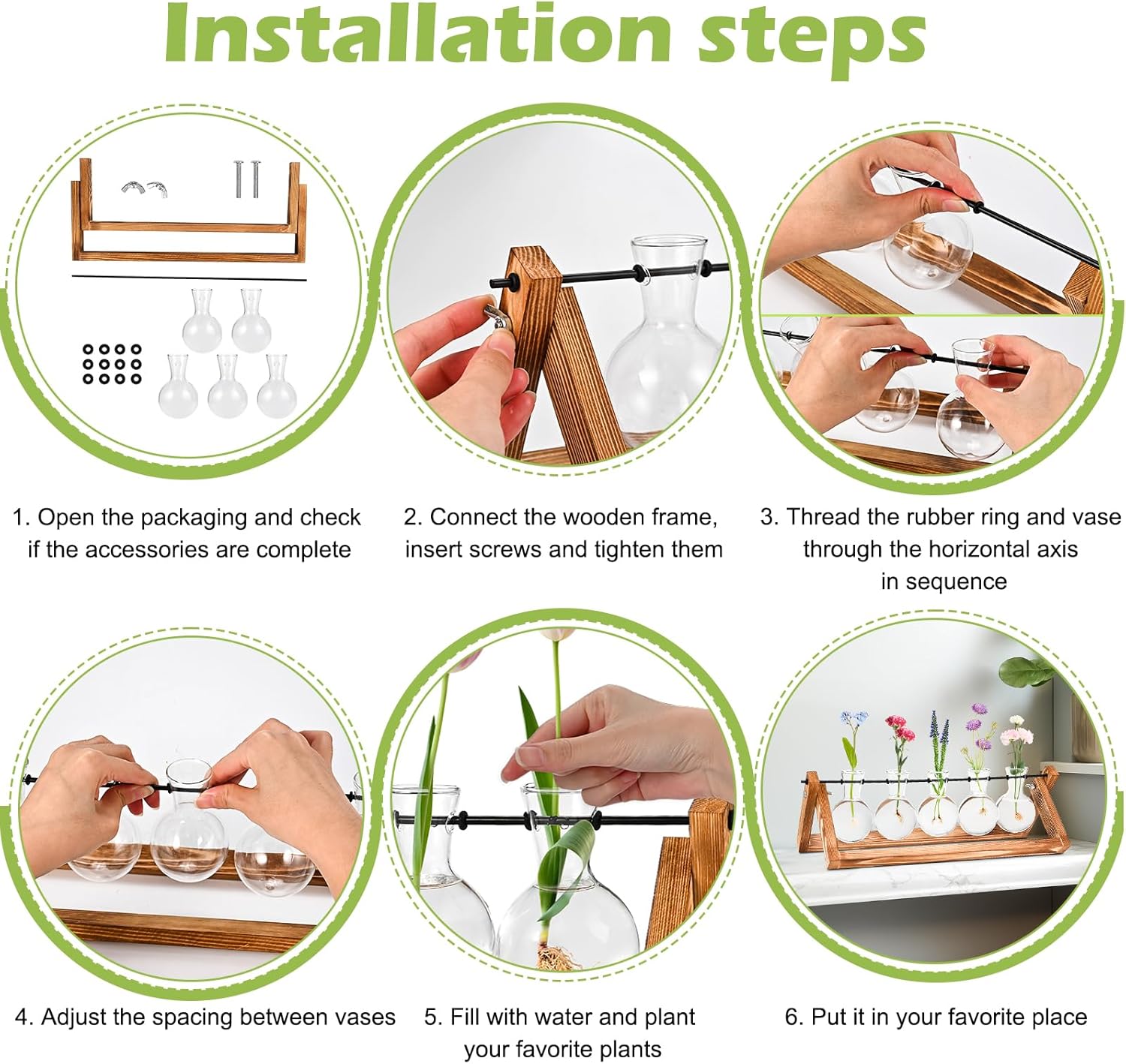 - 3. Minimalist design: Combining natural retro-colored wooden frames with 5 transparent glass bottles, this versatile planter is perfect for showcasing artificial or freshly cut flowers, bouquets, and aquatic plants.