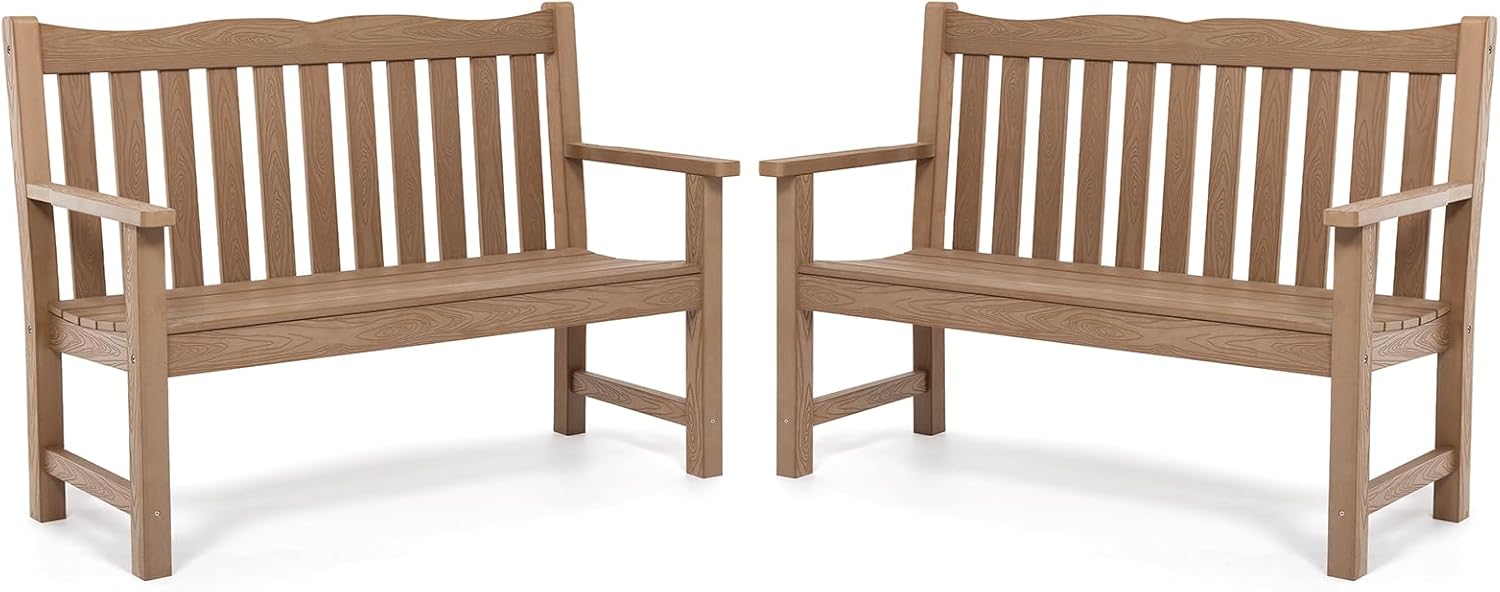 Outdoor Benches Set of 2, 2-Person Poly Lumber Garden Bench, Never Rot or Fade, Looks Like Real Wood, Teak