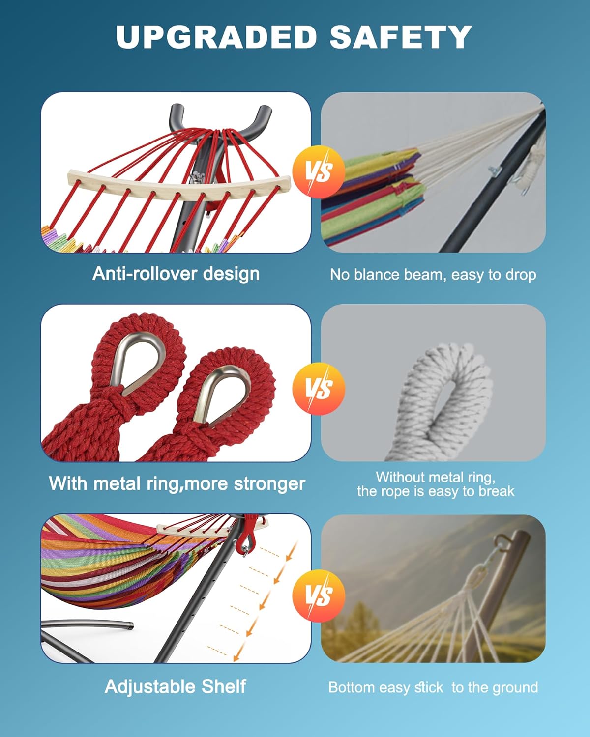 - Anti-Rollover Design: Our double Hammocks feature Balance spreader bars for an anti-rollover design, ensuring even hole spacing and a tight hammock for optimum balance. Enjoy a secure and stable relaxation experience
