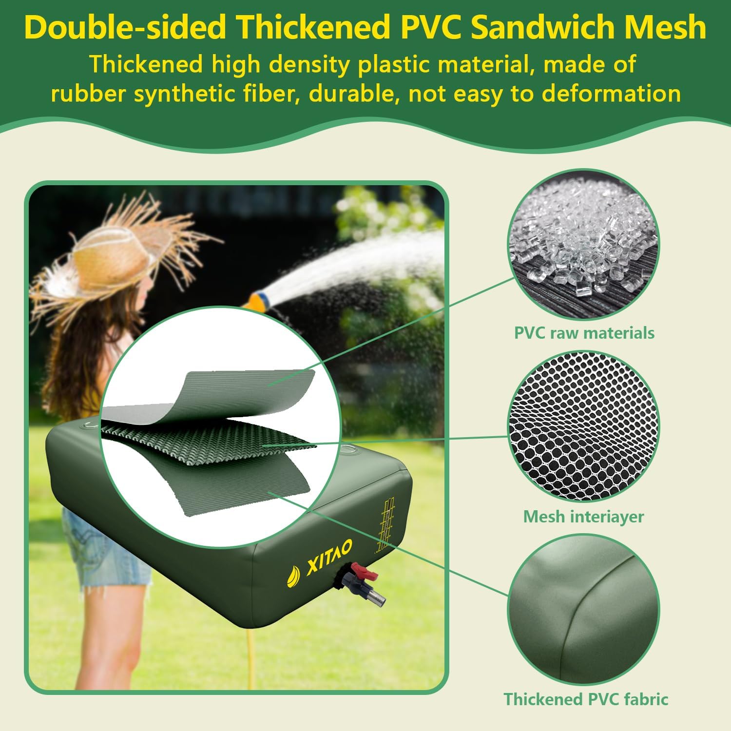 - 【Thicken 1300D PVC Materials】Made from premium thicken 1300D PVC material, this rain barrel is super strong and durable. It has unique properties such as rainproof, fireproof, waterproof, tearing force, non cracking, wear-resistant, stretch resistance and UV resistant, antistatic, and easy to form. Water storage containers can be used repeatedly for many years. This material is also eco-friendly safe, non-toxic and odorless.