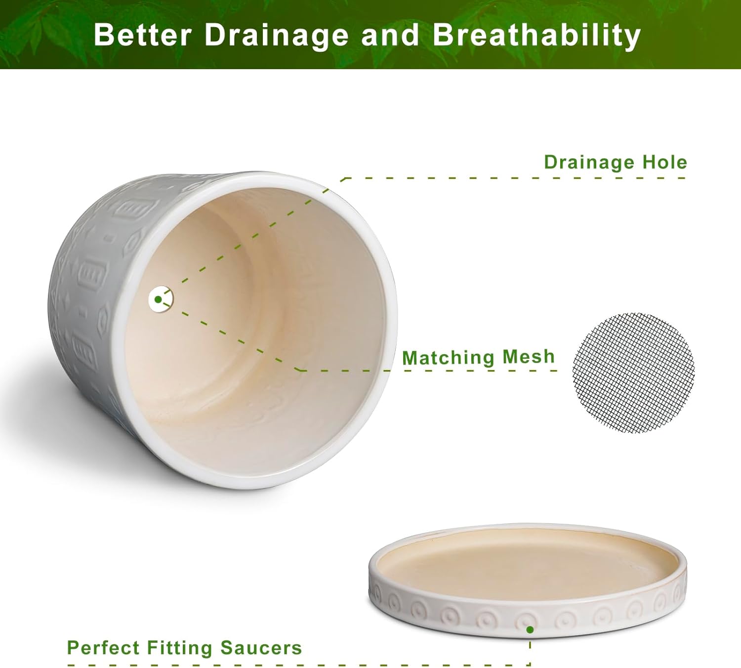 - Optimal Drainage: The plant pots with drainage holes and saucers ensures high and well water flow and air circulation, keeping your plants healthy while preventing excess water from spilling and staining your surfaces
