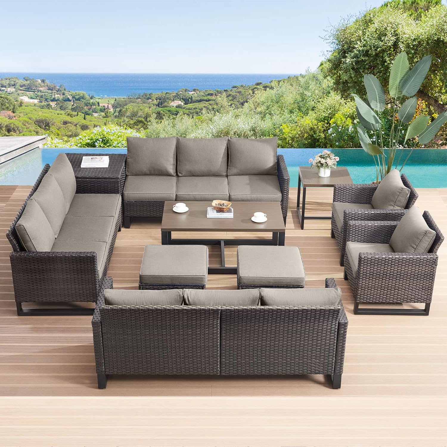 HUMMUH 10 Piece Patio Furniture Set PE Wicker 3 Outdoor Sectional Sofa Set with Patio Chairs Dinning Table Ottomans for Porch,Garden,Backyard,Deck(Brown/Grey)
