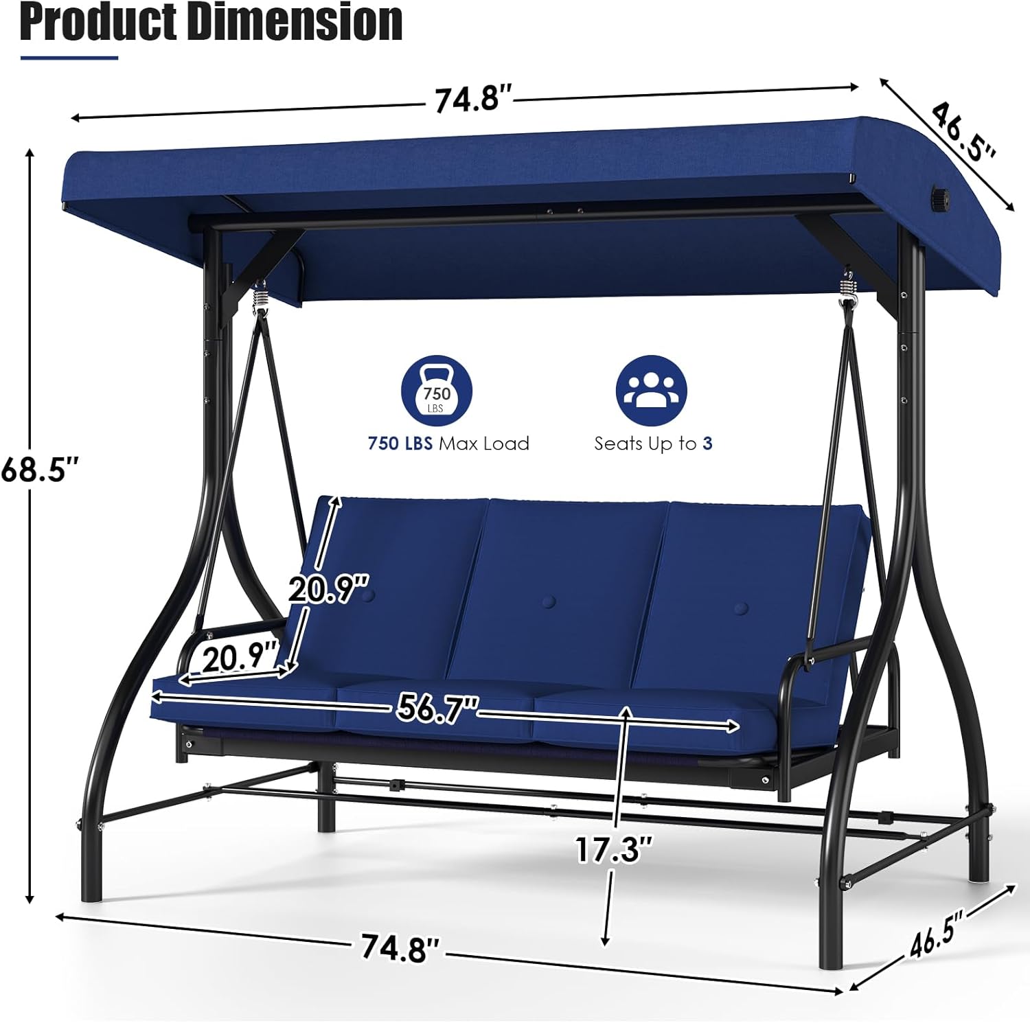 MAMIZO 3-Seat Patio Swing with Adjustable Canopy & Backrest, Outdoor Porch Swing Chair for Adults, Outside Porch Converting Bed Thickened Removable Cushions, 2mm Steel Pipe, for Garden, 750LBS