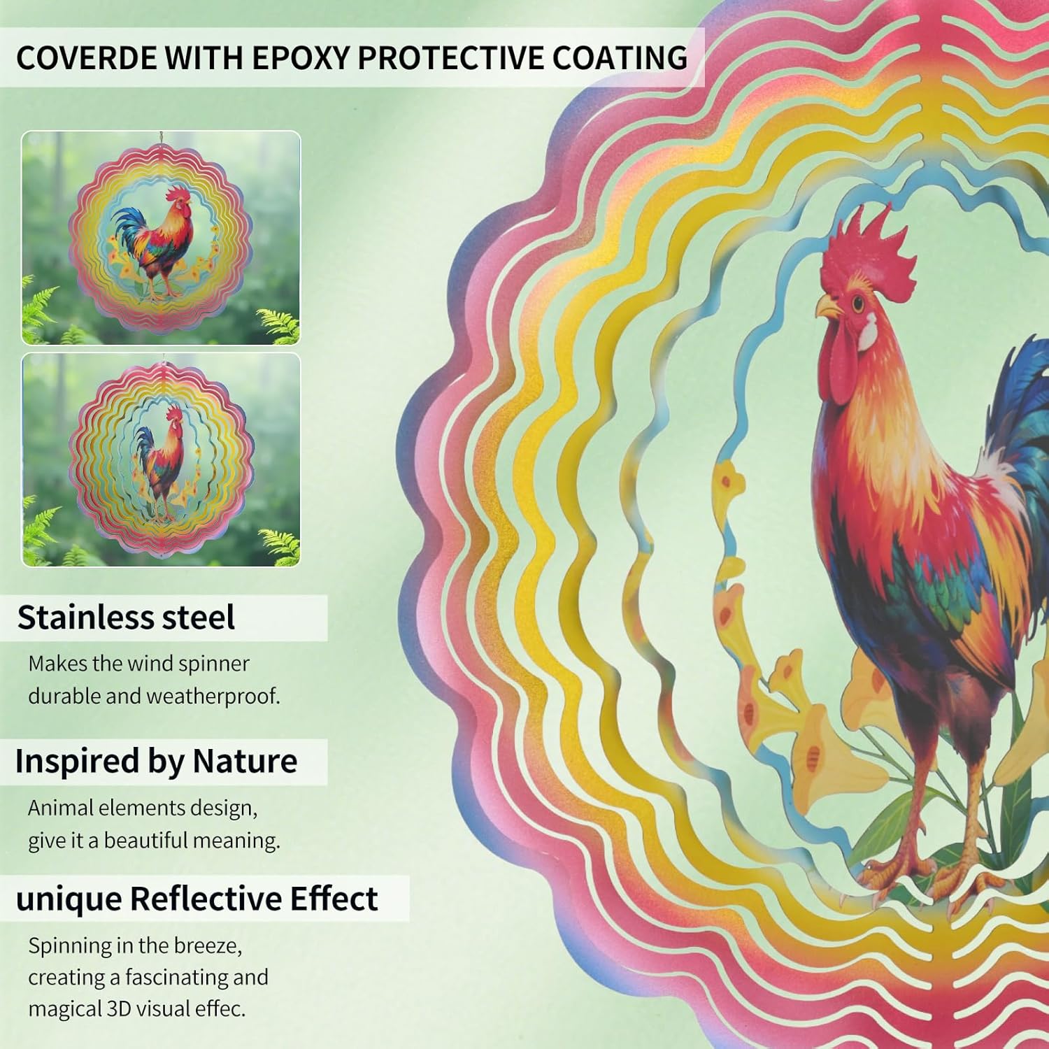 - Captivating Magical 3D Visual Effect - Cawalap Chicken Wind Spinner surface of the metal wind spinner is additionally coated with a unique layer of colorful reflective material, when the breeze blows, the reflective colorful glitter material gives off a sparkling, creating a fascinating and magical 3D visual effect, its beautiful light reflecting and attractive view, for balcony, garden, patio, porch, backyard, courtyard, both indoor and outdoor will beautify decor your home.