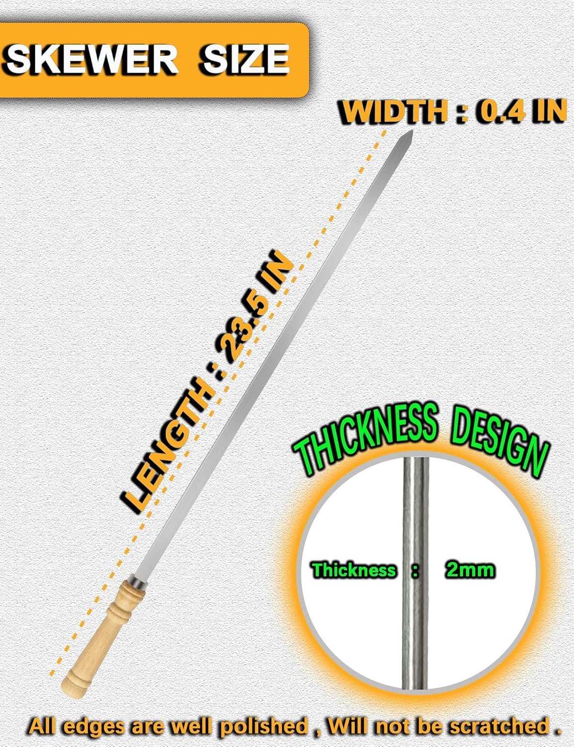 - 【FOOD GRADE 304 STAINLESS STEEL】JOWHONK BBQ 304 stainless steel skewers for grilling are 23.5 inches long,0.4 in width,0.07 in thickness. Our wooden handle flat metal skewers for kabobs are made of premium 304 stainless steel, Ensuring non-rust long time durability, Heat resistant and non-poisonous,Harder than other stainless steel and iron.It's safety for children.Our Premium Stainless steel Barbecue skewers are reusable. The BBQ kabob skewers surface is smooth that grilled food residue won't get stuck onto the kabob skewer blade.