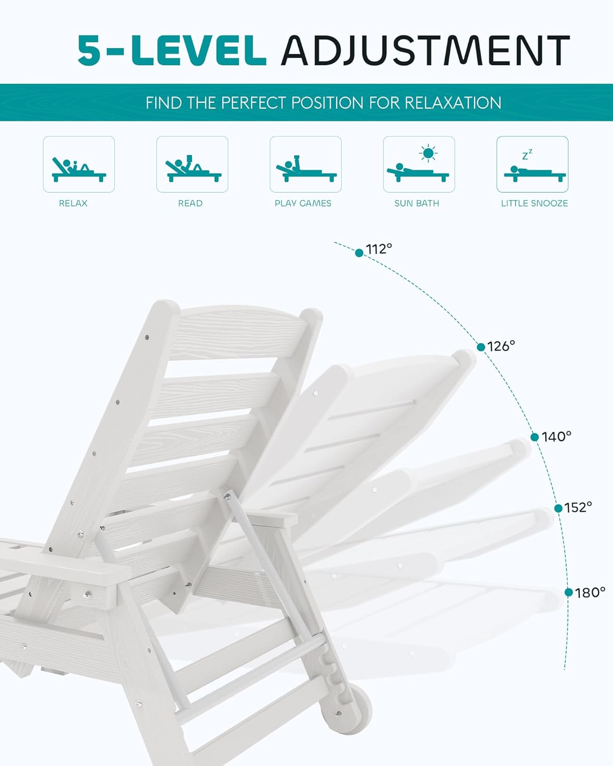 SERWALL Patio Chaise Lounge Chair Set of 4, 5 Positions Adjustable Poly Outdoor Lounge Chair for Pool, HDPE Lounge Chair with Rolling Wheels & Cup Holder for Poolside, Deck, White