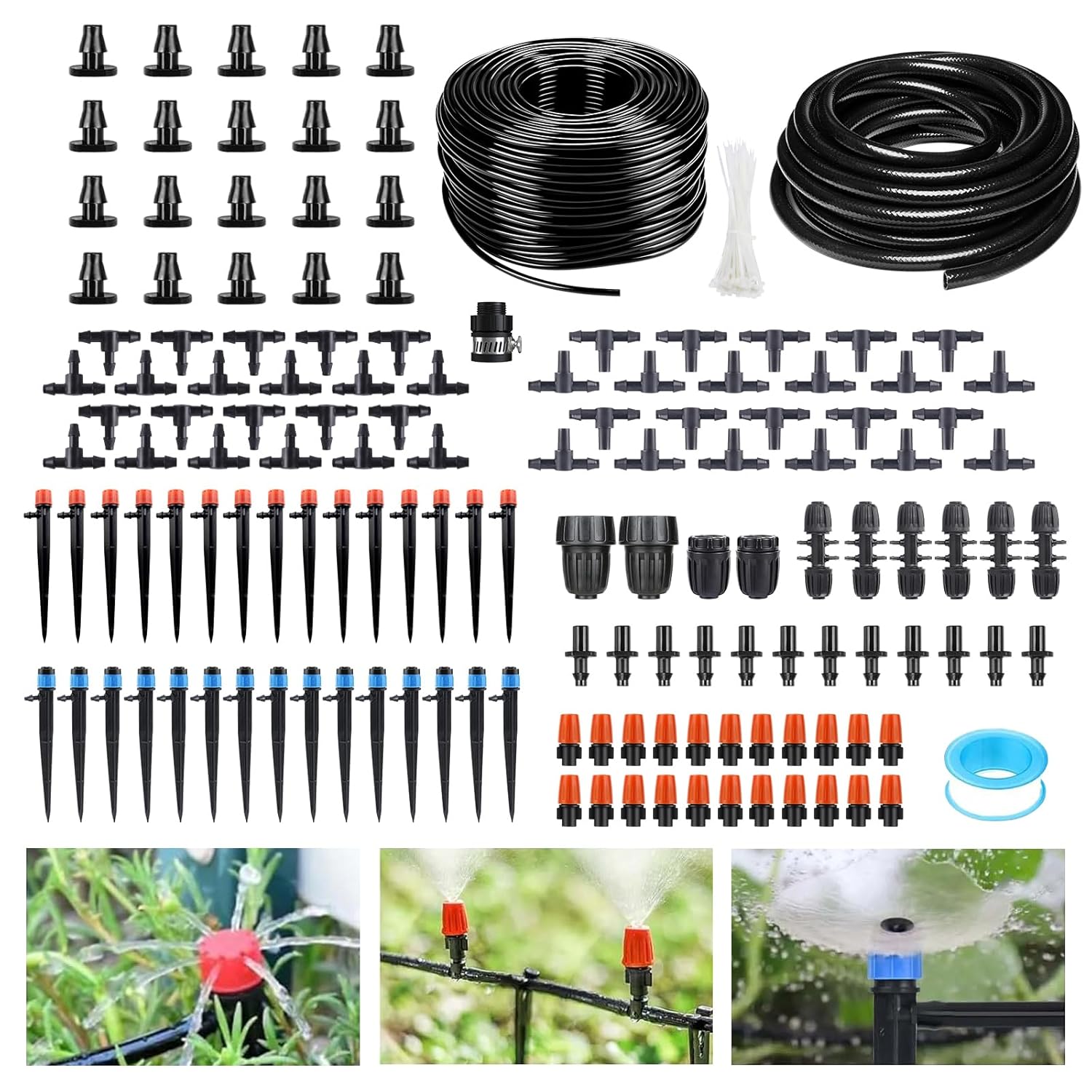 - 256FT Drip Irrigation Kit: Drip irrigation system, equipped with a versatile range of components, caters to all your garden watering needs. Includes essential parts such as 210ft 1/4'' irrigation tube, 46ft 1/2'' irrigation tube, 1/2ββ Lock Barbed Tee connectors, drip emitter streams, vortex emitters, Blue Mist Nozzles, Quick connection tees, Faucet Connector, and more.