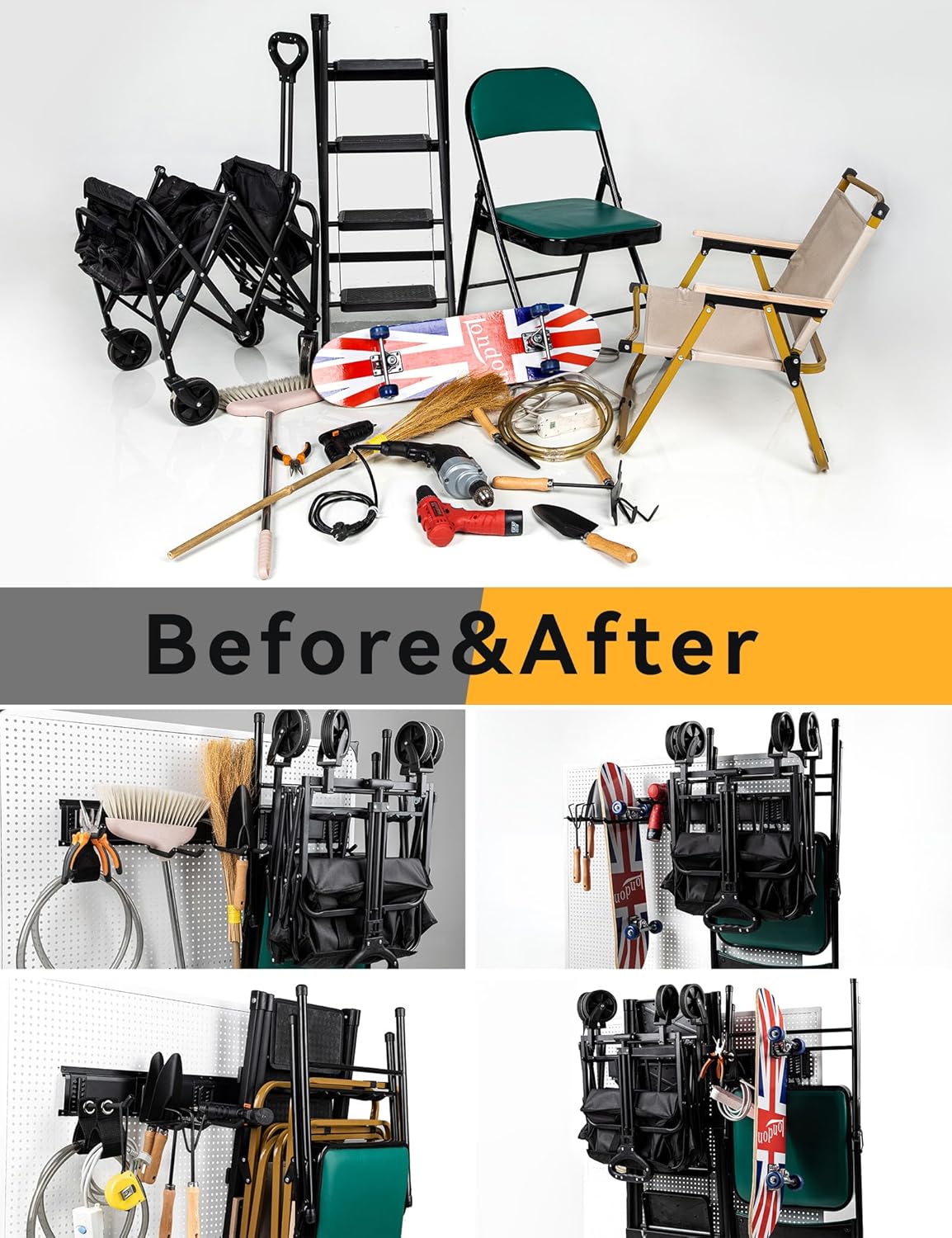 - [GARAGE WELL-ORGANIZED & SPACE SAVING] The wall mount tool organizer can help to hang all your tools on storage racks, and provide superb organization for your garage, utility room, garden, workshop, basement, say goodbye to mess and clutter. Each item has its place and is easily accessible, no need to waste time to search your tools