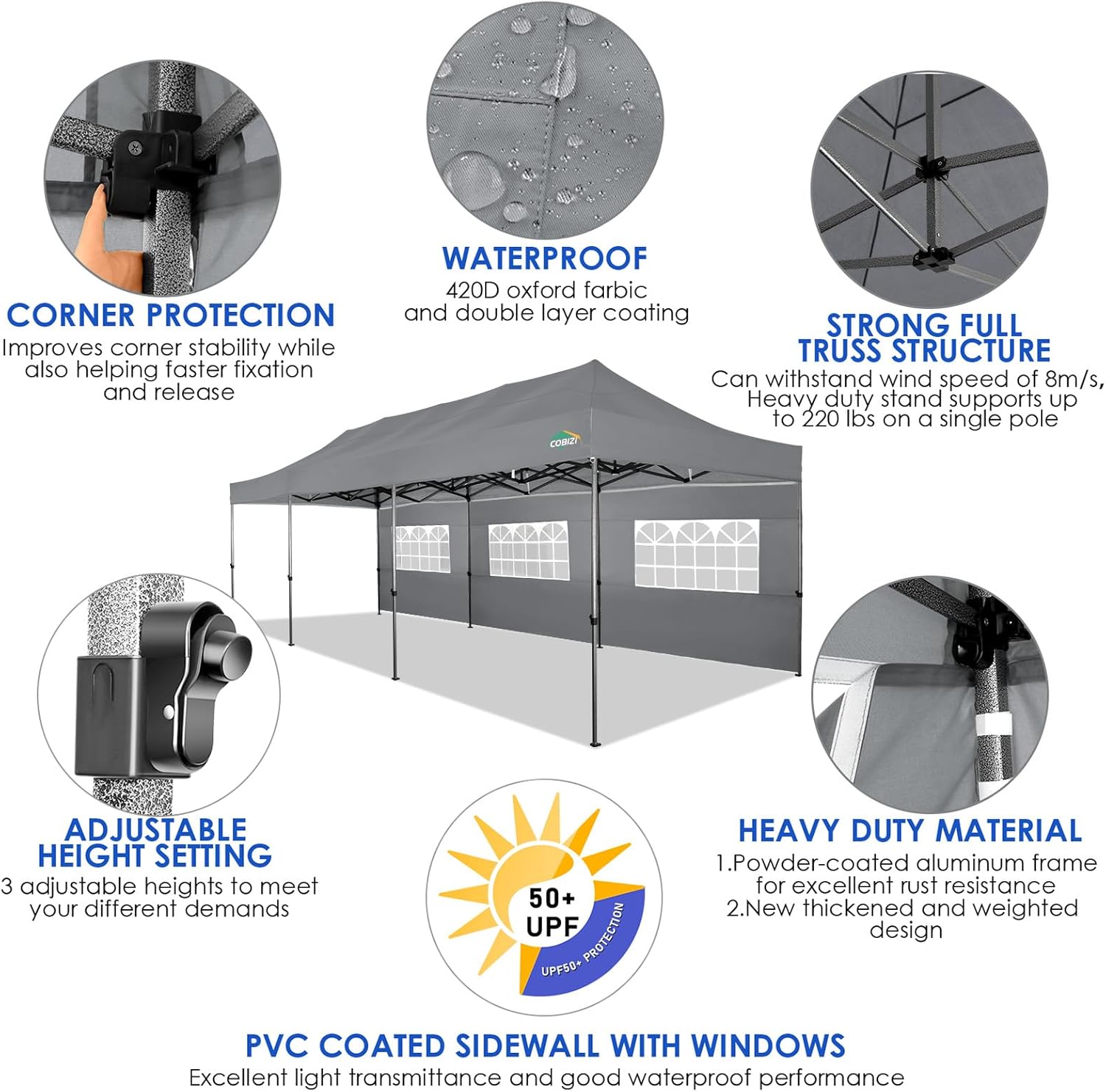COBIZI 10x30 Pop up Canopy Tent 10x30 Canopy with Sidewalls, Heavy Duty Party Tent Tents for Parties, Foldable UPF 50+ Waterproof Commercial Ez up Canopy with Roller Bag, Grey(Windproof Upgraded)