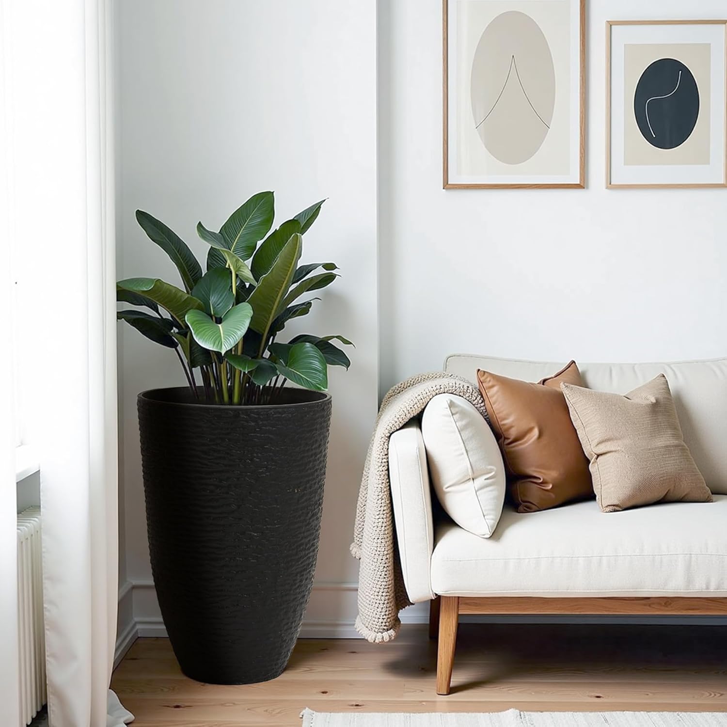 WORTH Garden 2-Pack 21" H. Black Tall Planters with Inside Pots - 14'' Dia Plastic Large Round Plant Tree Pots - Decorative Imitation Stone Finish for Indoor Outdoor Front Porch Container Patio