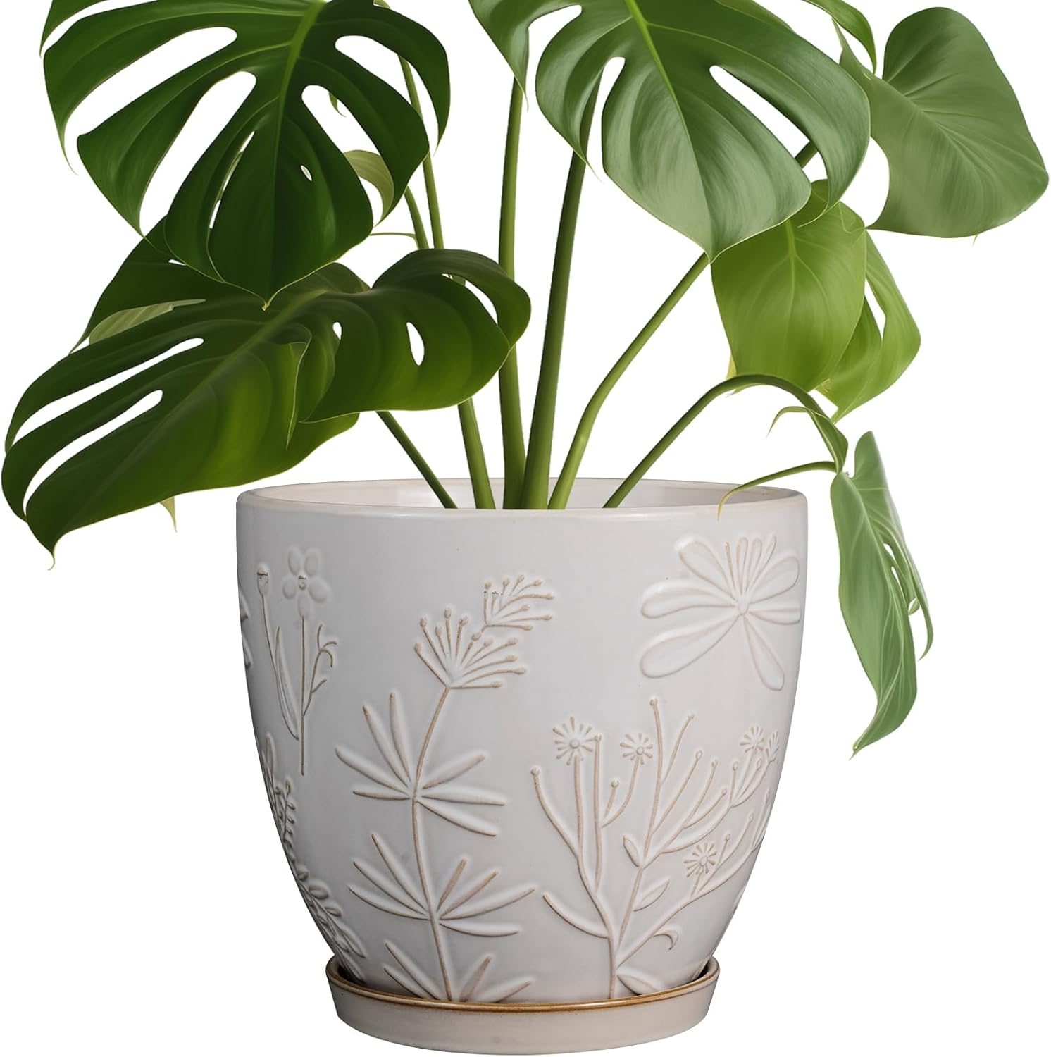 - Stylish Appearance: Our ceramic planter has a white main colour, a beautiful embossed petal and leaf pattern on the surface, elegant appearance making it ideal for home decor, garden decor and office decor