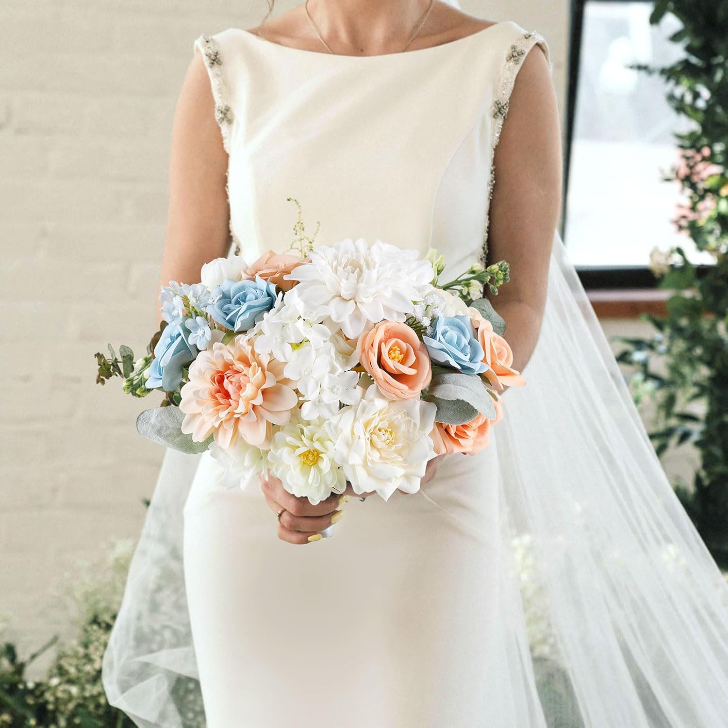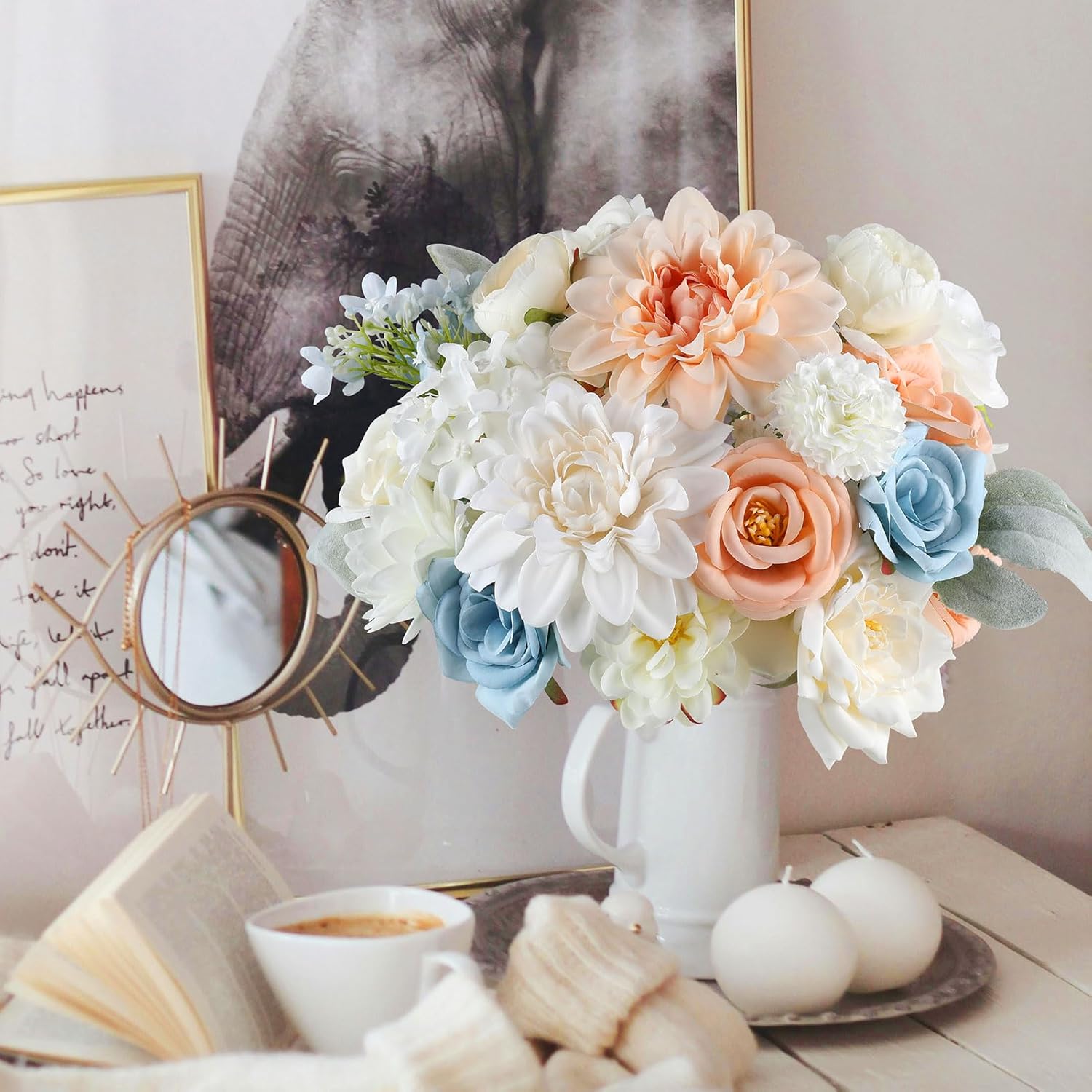 - 【Package Includes】Austin roses x 2; roses x 6; Dahlias x 2; peonies x 4; hydrangeas x 5; daisies x 1; babys breathx 3; Other berries Stems, leaves, manzanita artificial flowers x 12.