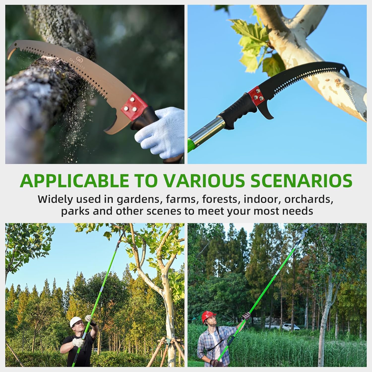 - Versatile Pruning Tool: With an adjustable length from 7.8 to 27 feet, this detachable pole saw easily adapts to any task. It can be used for trimming tall trees or as a handheld saw for cutting low branches, shrubs, and logs. Perfect for forestry, gardening, and landscaping, it’s suitable for a variety of pruning jobs.