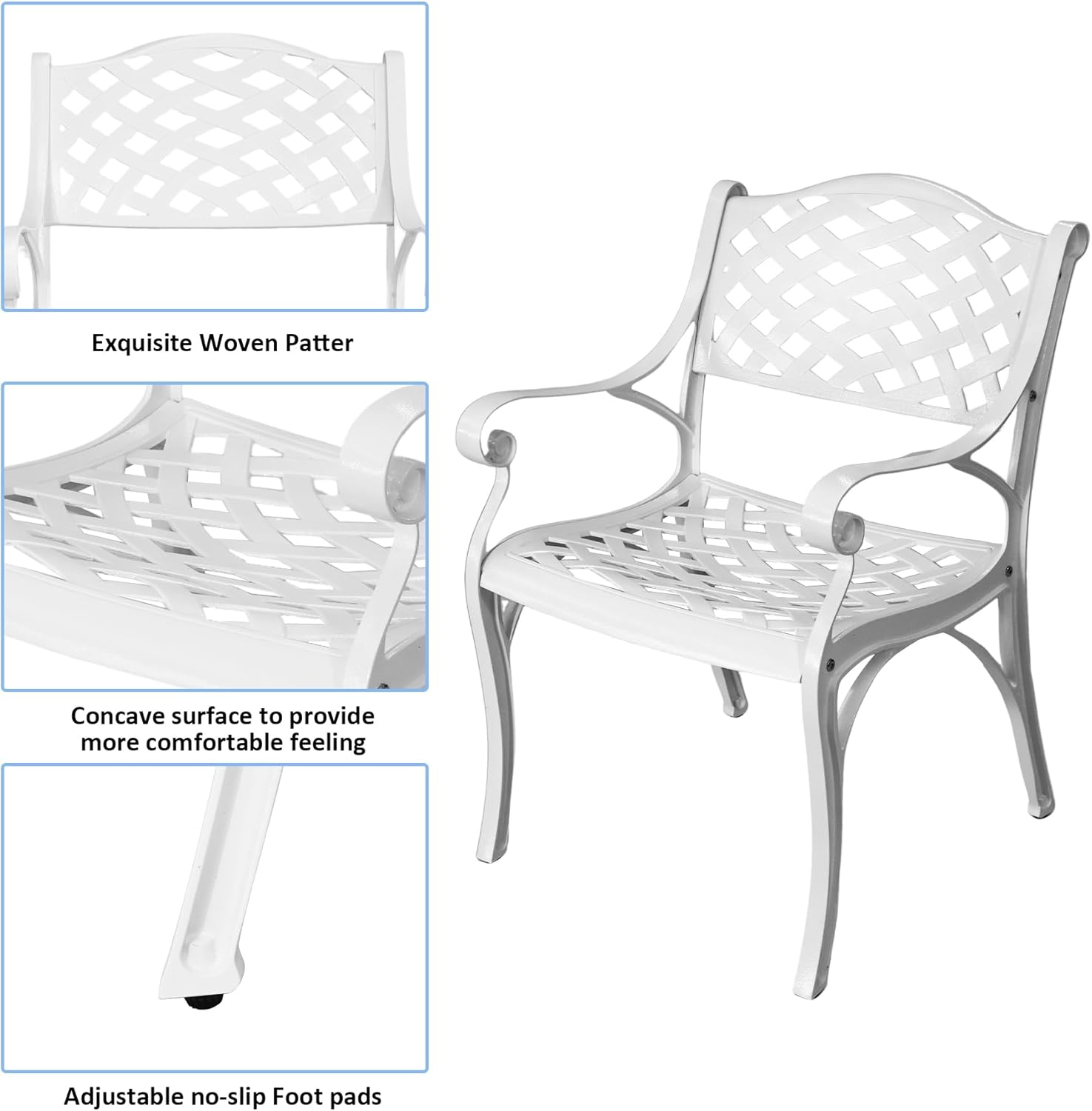 - All Weather Materials: Made of sturdy cast aluminum with a rust-resistant and fade-proof finish. Our patio bistro set is durable but lightweight, the maximum weight capacity of table is 250lbs, maximum weight capacity of a single chair is 300lbs.