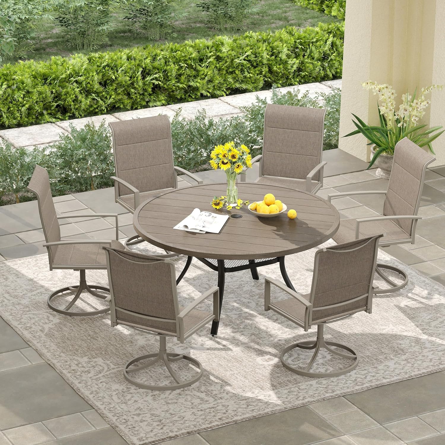 DIFY 48" Round Patio Dining Table for 6, Outdoor Metal Dining Table with 1.57" Umbrella Hole for Backyard Lawn Garden, Grey Wood-Like