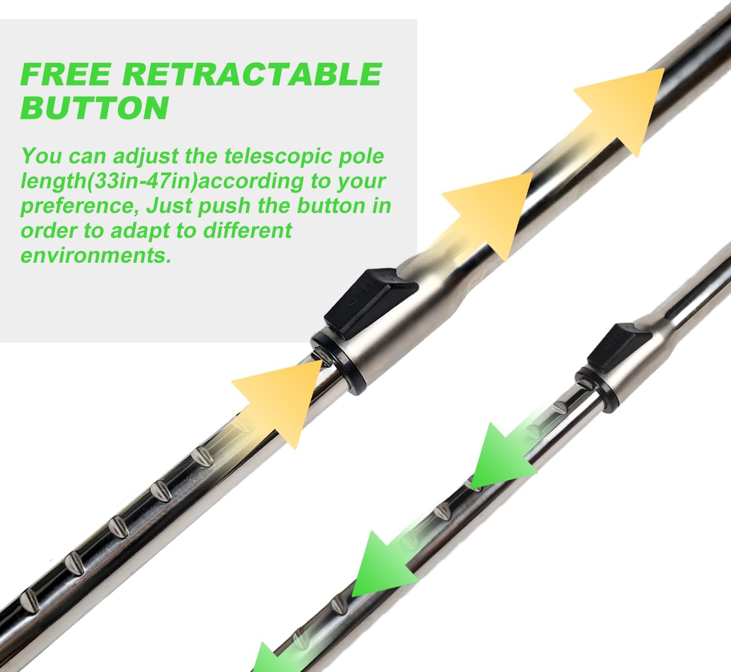 - [Ergonomic trimming handle with adjustable height and rotating head] Electric cordless weeder with extra effort-saving handle without bending over. Work in the most comfortable position, greatly reducing the stress on the back and waist. One click adjustable telescopic rod length from 34-50inches to provide the length required by each individual. The Angle of the head can be adjusted from 0-90°, allowing you to easily take care of any hard-to-reach nooks and crannies.