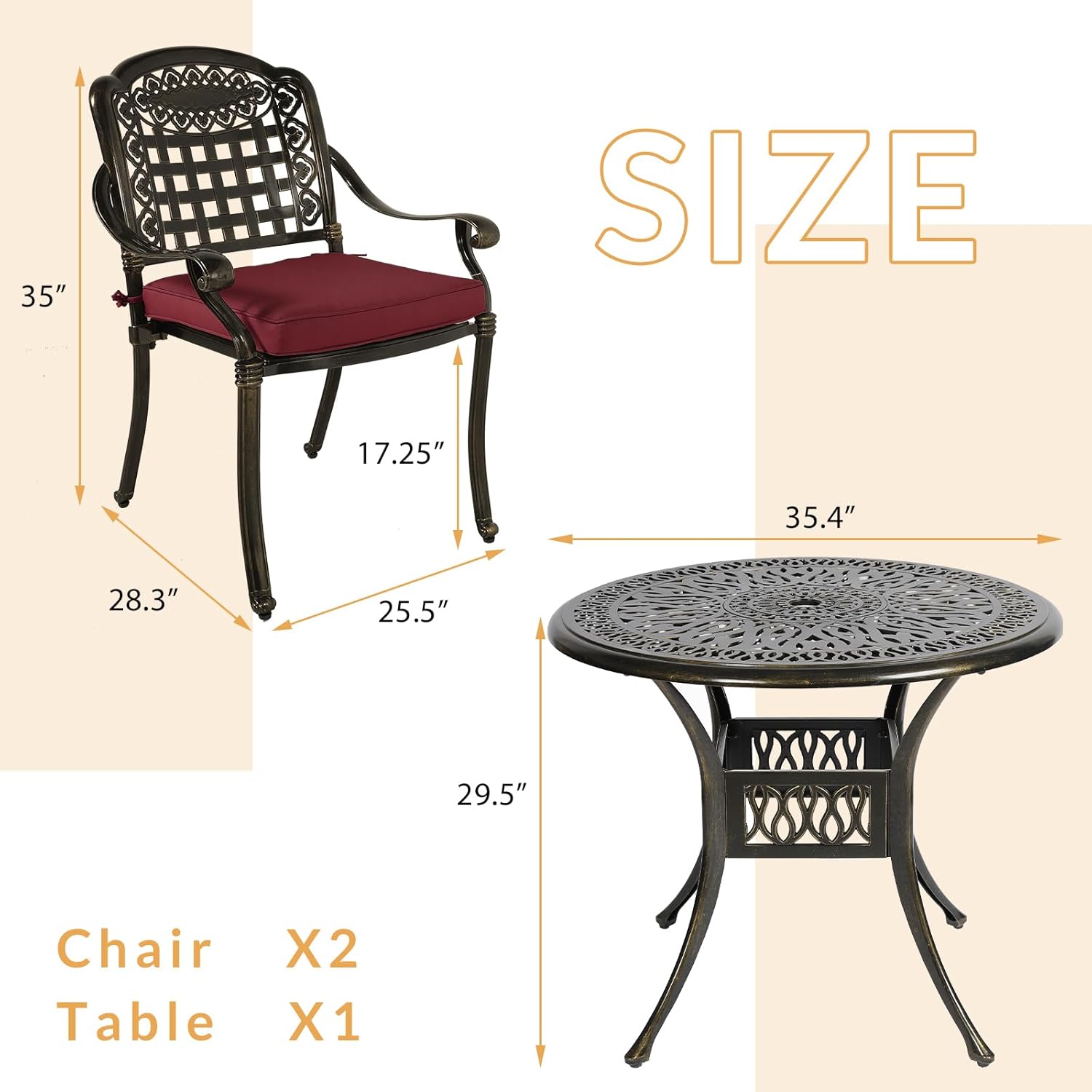 - 【Dimensions】 - Our round table is 35.4"(Dia) x 29.5"(H), and each of 2 chairs is 25.5"(L) x 28.3"(W) x 35"(H), cushion is 19''(L) x 19''(W) x 2.8''(H), you’ll love how this furniture set uniquely accents your space. Quickly assemble so you can enjoy it in no time, all hardware, tools and instructions required are included for easy assembly.