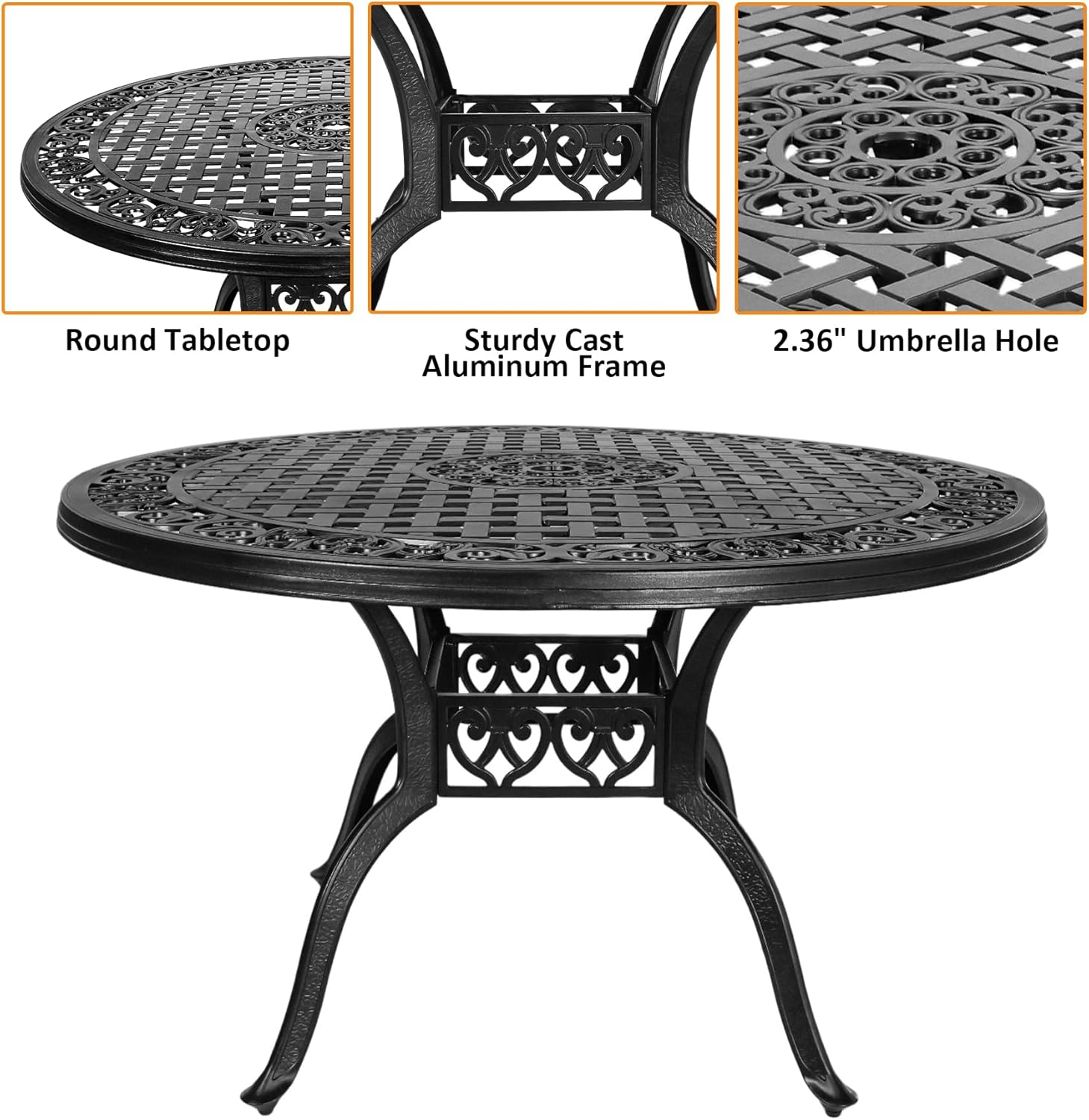48 Inch Outdoor Dining Table Round Patio Bistro Table Powder-Coated Cast Aluminum Frame Patio Dining Table Garden Table with Umbrella Hole (Black)