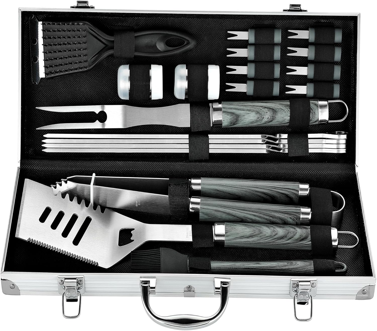 - Complete Grill Accessories Kit - Spatula, fork, tongs, basting brush, grill brush, salt&pepper shaker, 8 corn holders, 4 skewers, aluminium case.