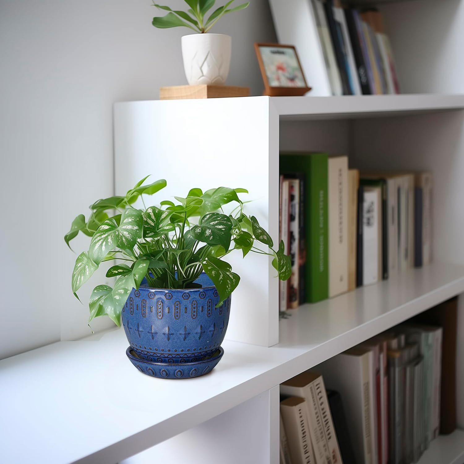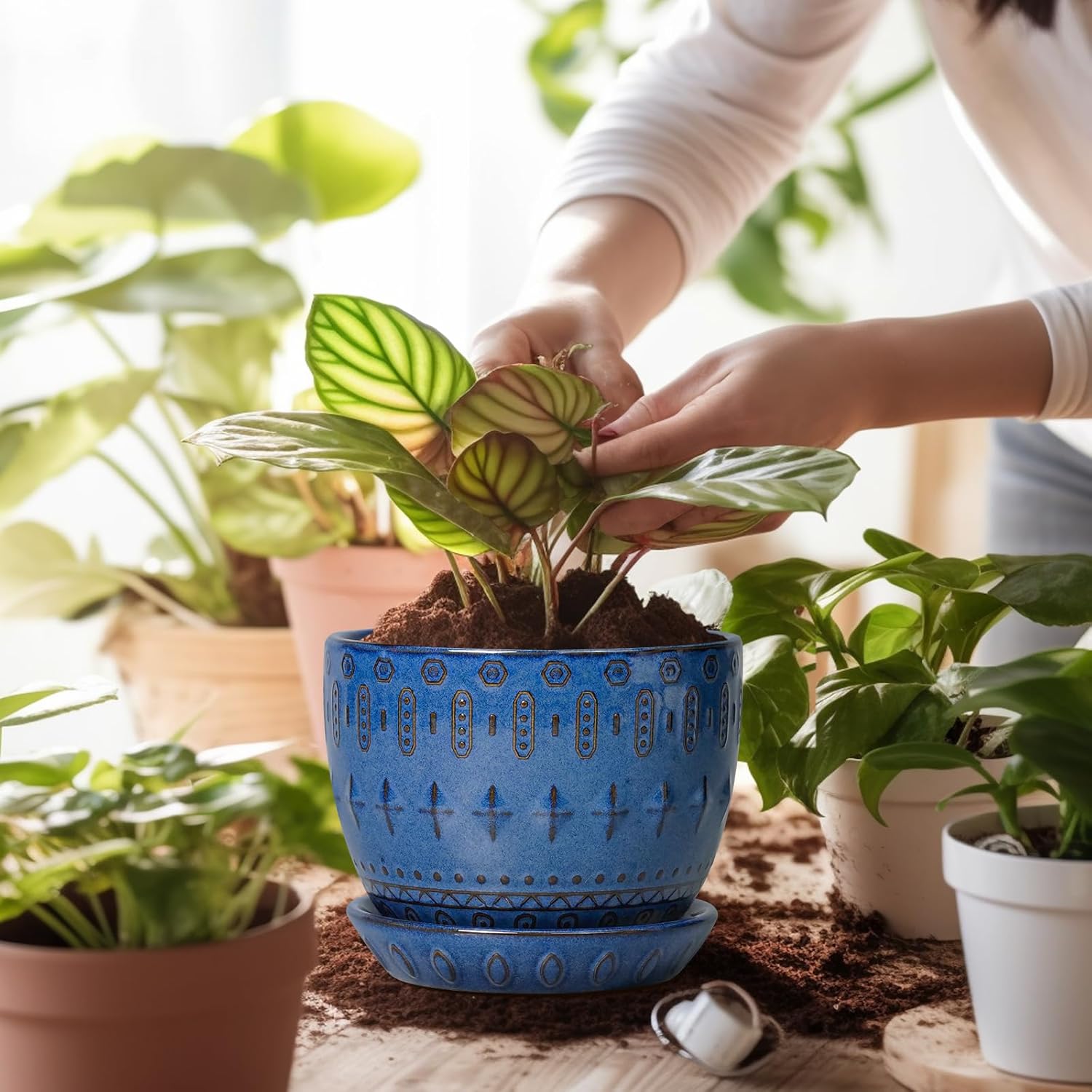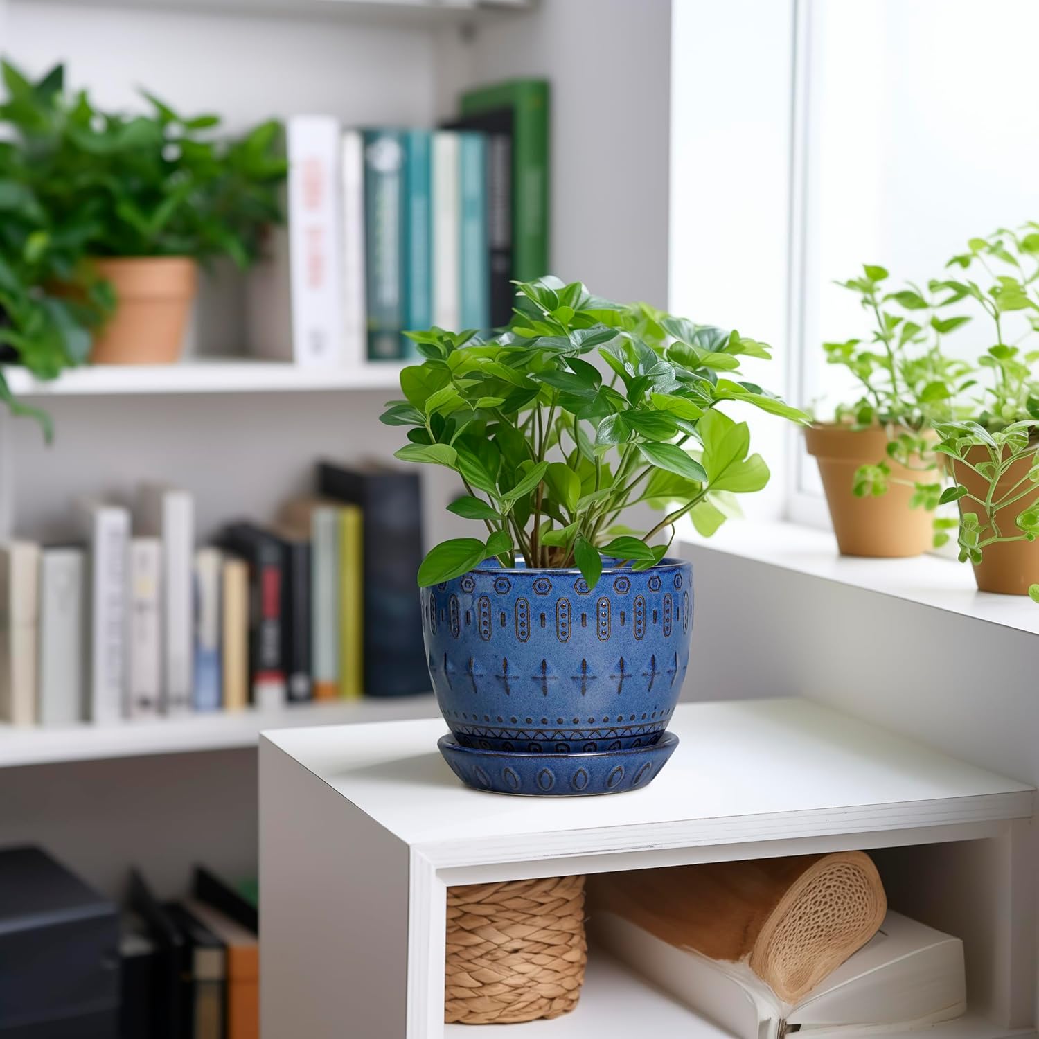 - Draining Hole and Saucer: This indoor plant pot comes with a plastic mesh and ceramic tray, which help drain excess water, retain soil, and keep your table tidy