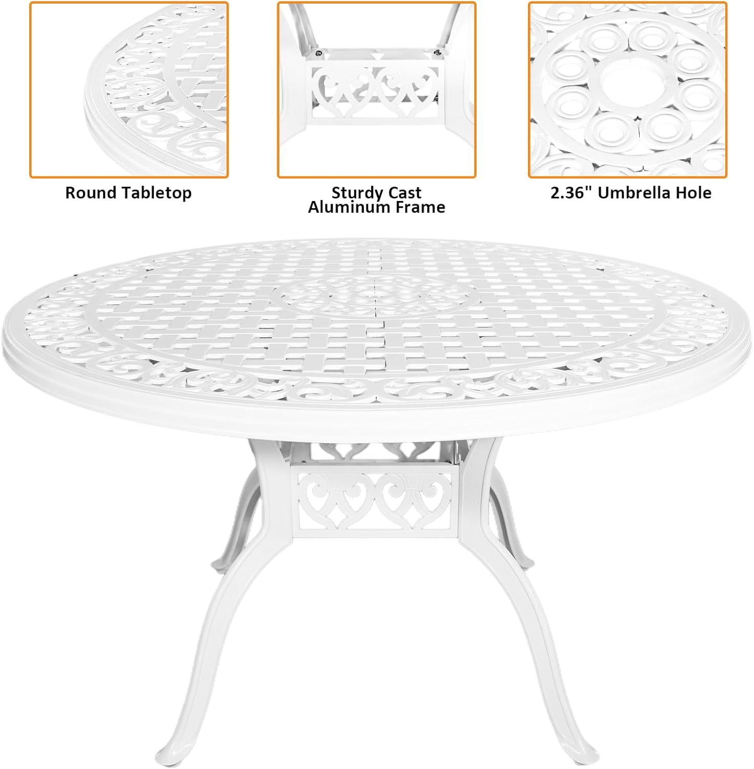 48" Round Patio Table for 6-8 Person Cast Aluminum Bistro Table with 2.36" Umbrella Hole,Metal Outdoor Dining Tables,Wrought Iron Patio Bistro Table,White Patio Table.