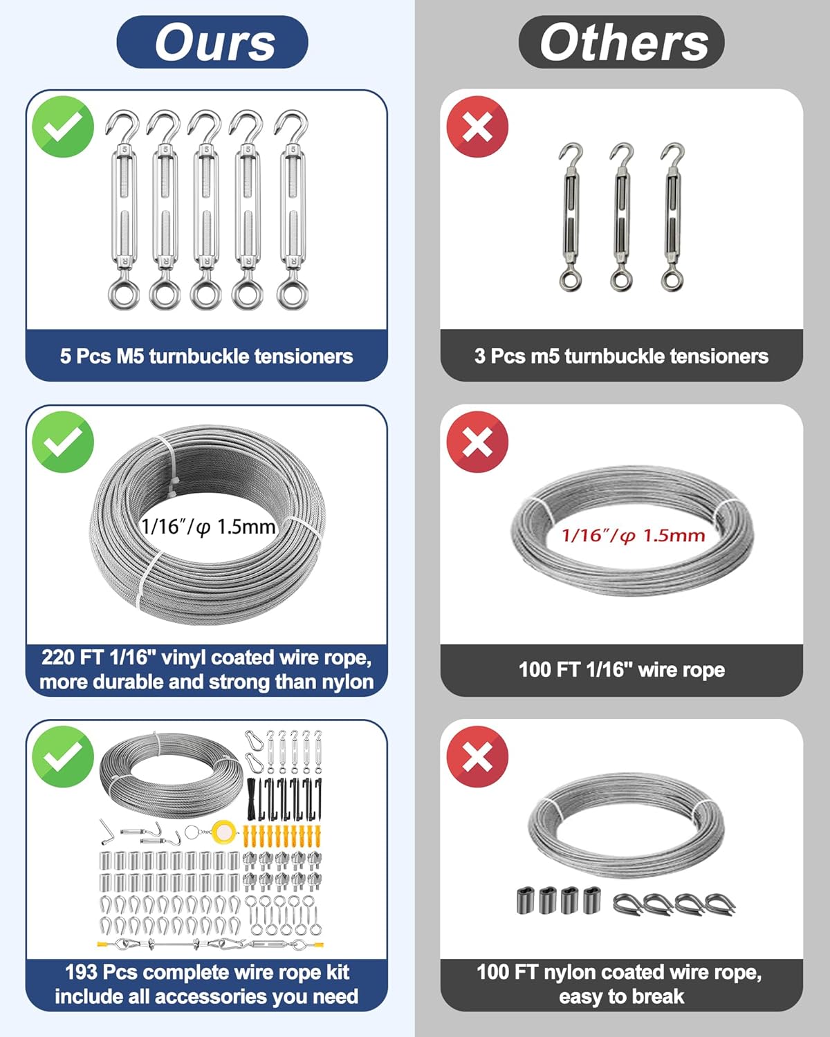 - [Versatile Applications] Premium coated stainless steel cable with adjustable turnbuckle tensioners and versatile hooks and anchors ensure safety, stability, and weather resistance for any occasion. Whether you’re setting up an outdoor tent, creating decorative rope displays, or hanging party lights, our wire rope kit has you covered. It’s perfect for outdoor string lights hanging, festival decorations, clotheslines, fences, plant traction ropes, and even picture displays in your backyard
