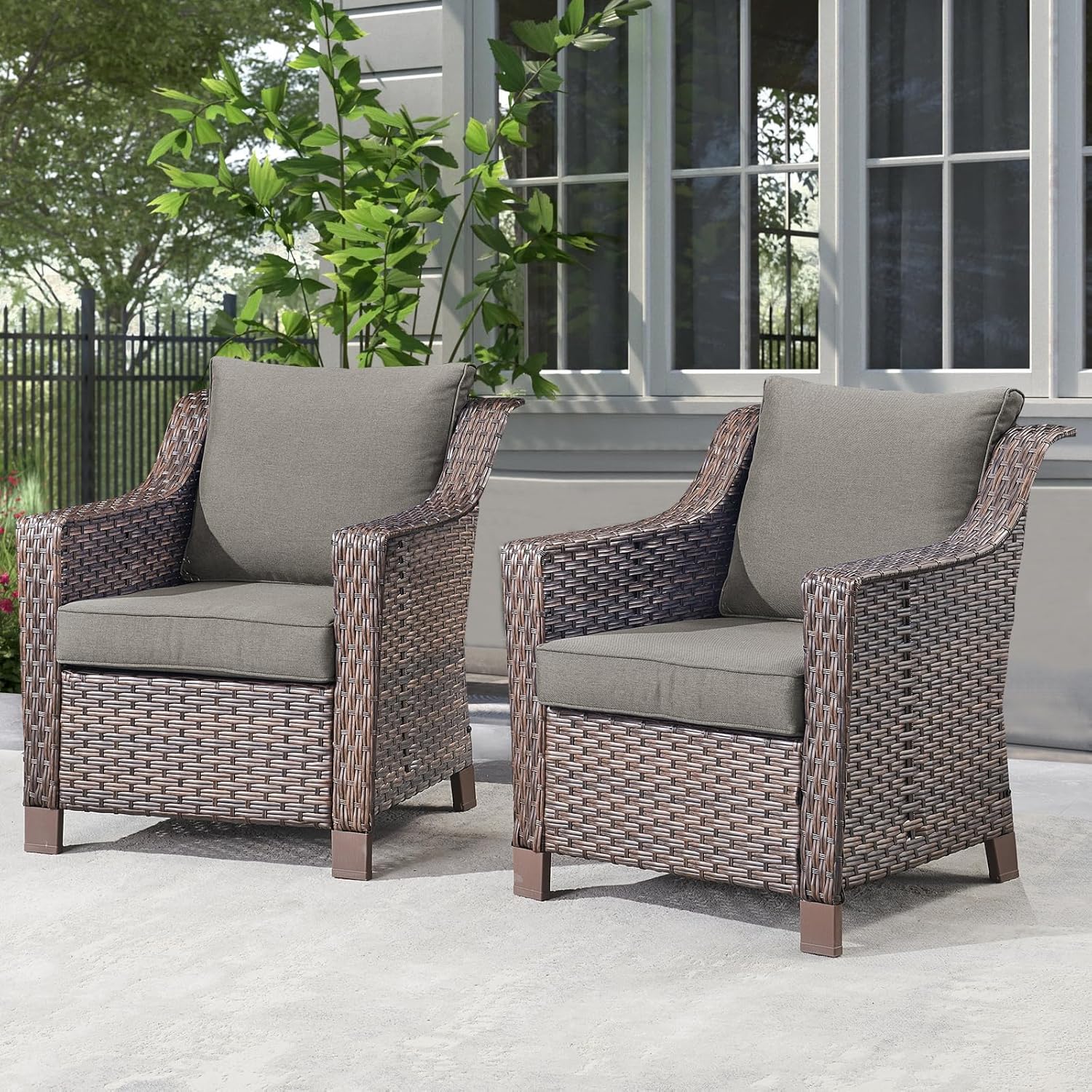 Outdoor Wicker Patio Chairs Set of 2 - Heavy Duty Outside Modern PE Rattan Lawn Chair for Front Porch Balcony Backyard Yard Deck Poolside Apartment – Brown/Grey