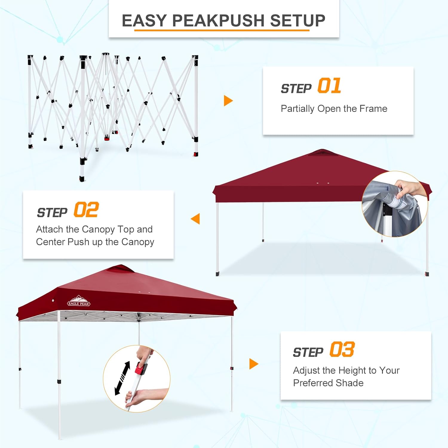 - EAGLE PEAK PROMISE: EAGLE PEAK offers 1-year limited after sale protection from the date of purchase. Unlike many other canopy sellers, EAGLE PEAK offers this for our frames, tops and bags! Please contact our professional service team with any questions