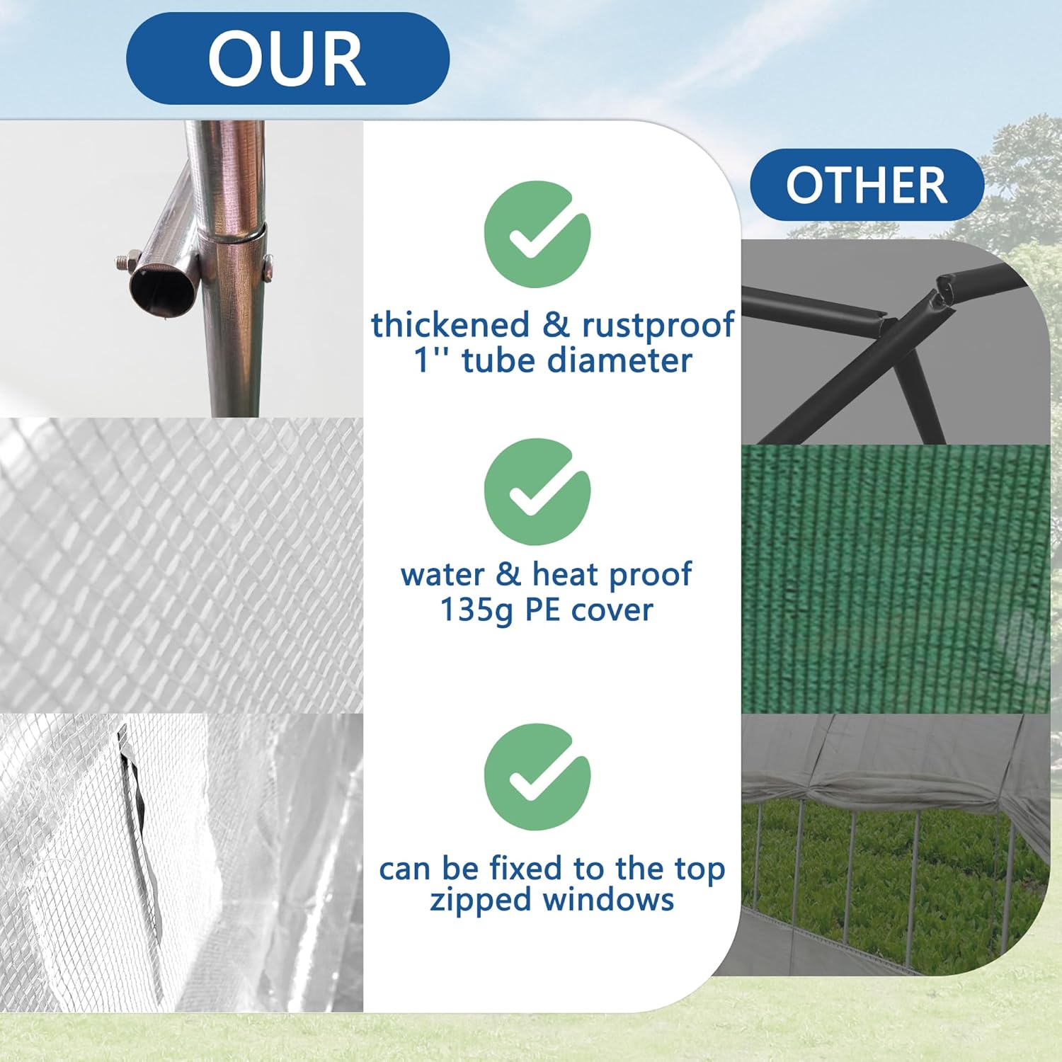 - 【Sturdy & Stable】Crafted with high-quality steel pipe frame, coupled with galvanizing technology, this portable greenhouse is built to withstand rust, corrosion, and fading. The hoop house also equipped with drawstrings and ground pegs to effectively fix the outdoor greenhouse.